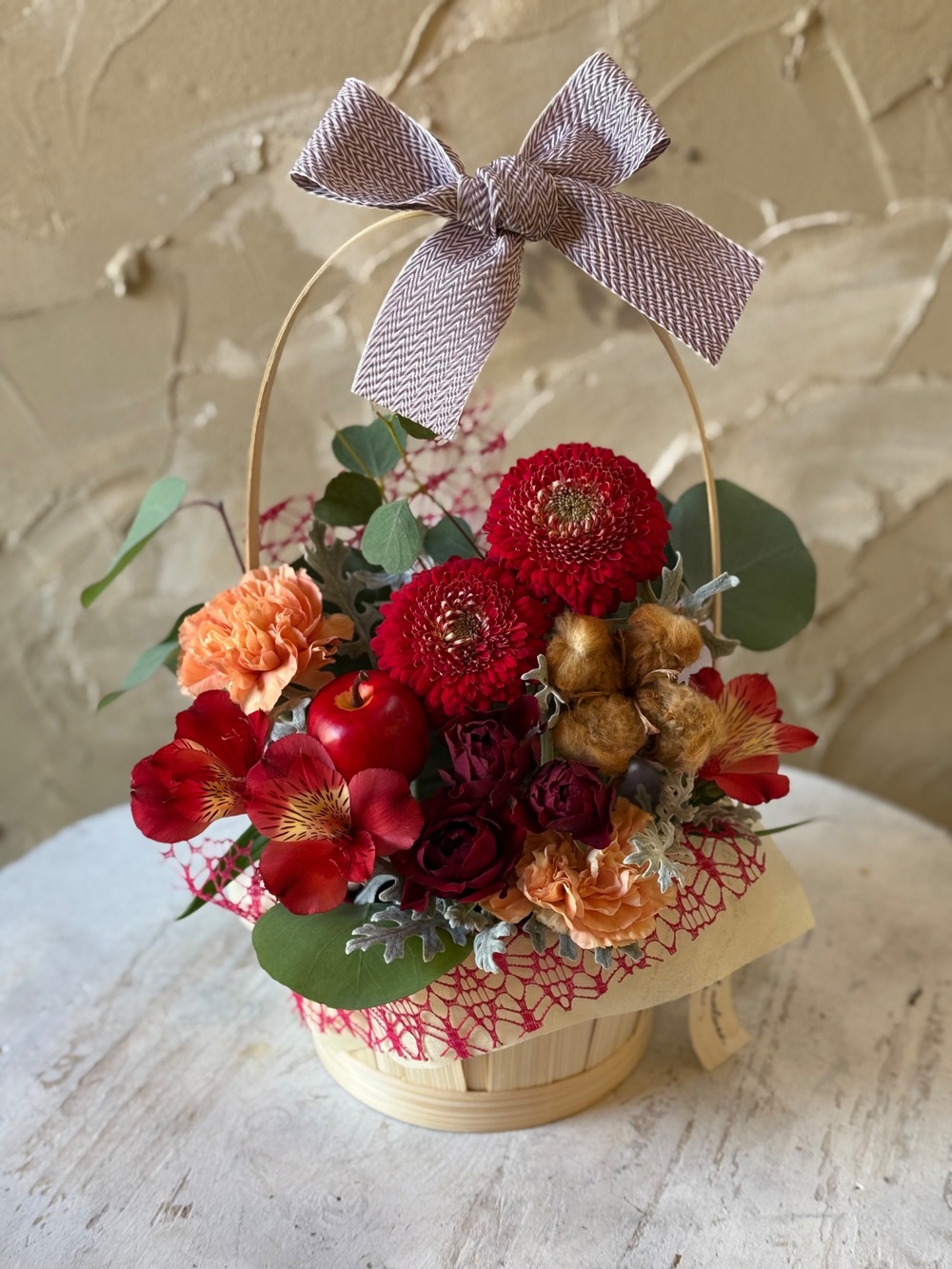 【冬限定】生花のリボンバスケットアレンジ 赤