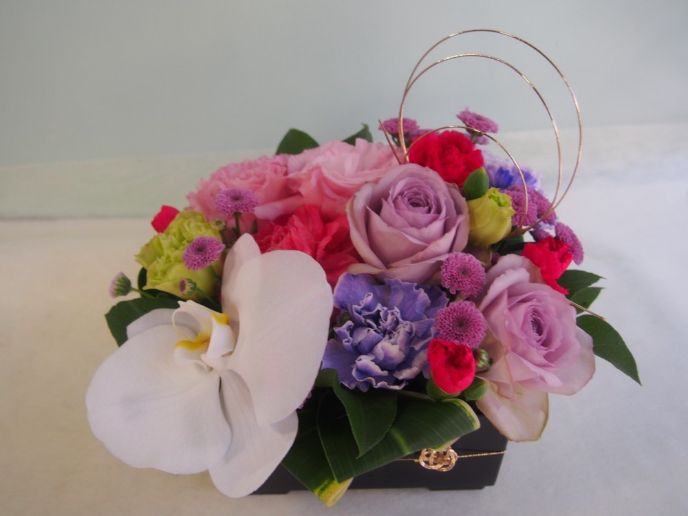 「幸福が飛んでくる」という花言葉を持つ胡蝶蘭に、和洋の花々を合わせ、品のある晴れやかな雰囲気でお作りいたします。