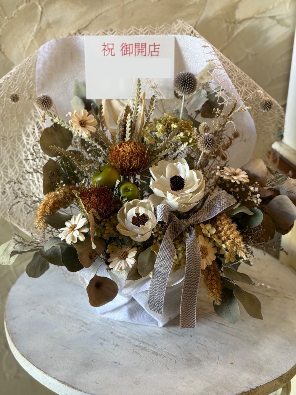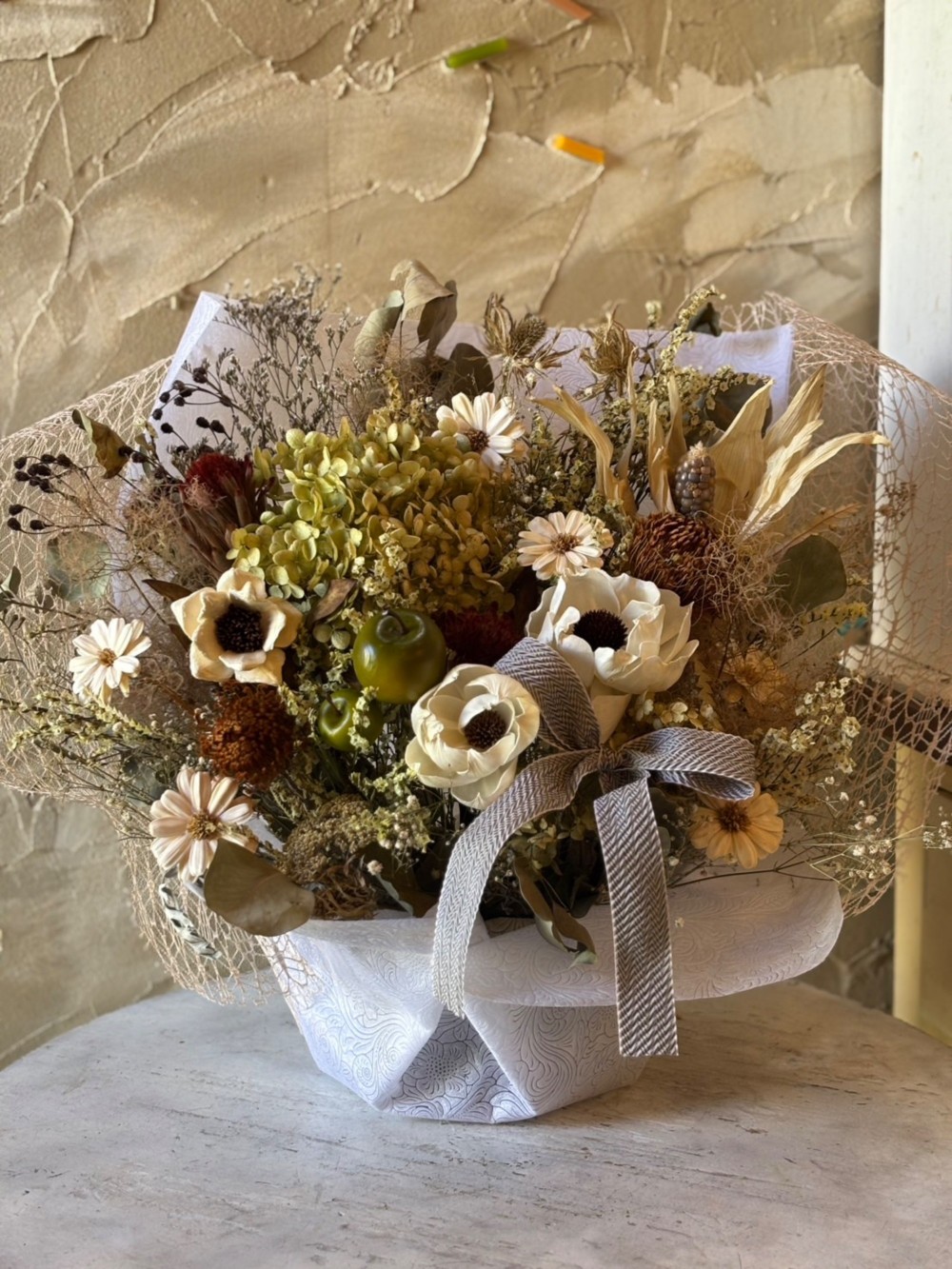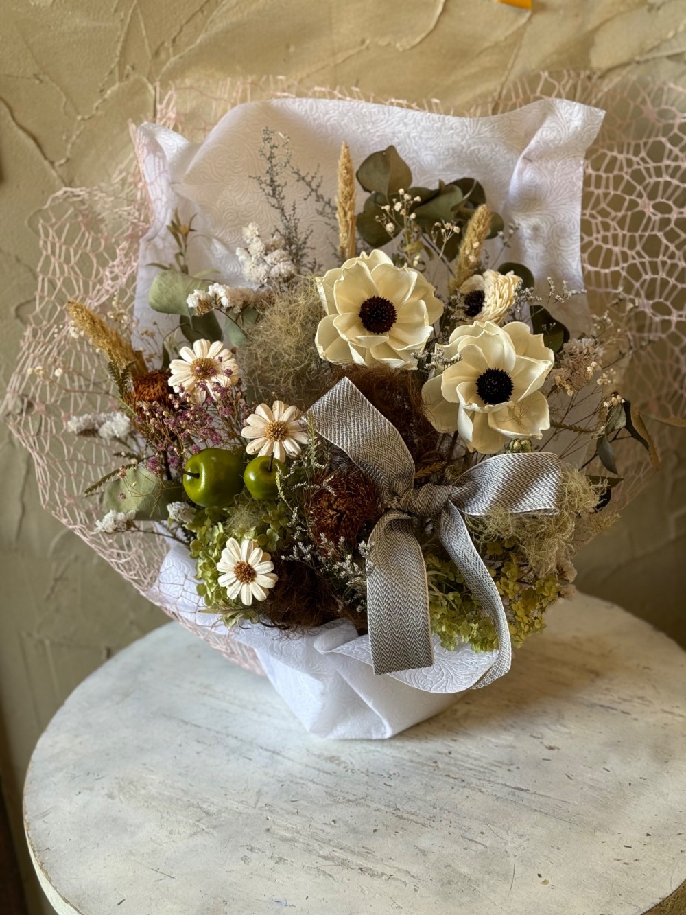 ひとつひとつ丁寧に仕上げたドライフラワーで、ナチュラルな雰囲気にまとめました。時間とともに深まる風合いも、ドライフラワーならではの魅力です。お部屋のインテリアとしてはもちろん、贈りものや、想いを伝えたい特別なシーンにもおすすめです。同じものは二つとない、自然から生まれたやさしい表情をお楽しみください。