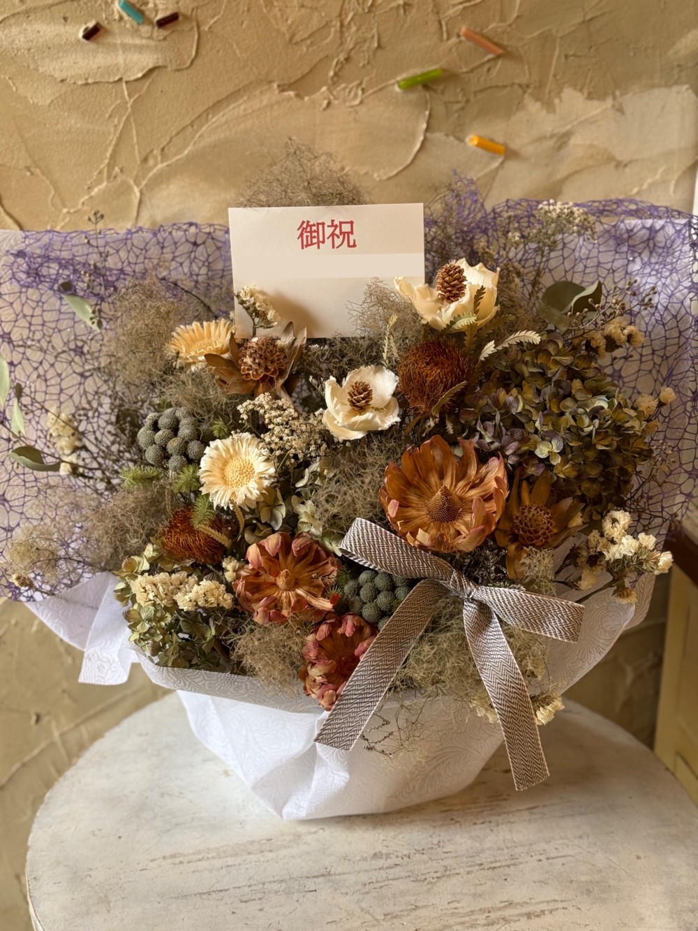 ひとつひとつ丁寧に仕上げたドライフラワーで、ナチュラルな雰囲気にまとめました。時間とともに深まる風合いも、ドライフラワーならではの魅力です。お部屋のインテリアとしてはもちろん、贈りものや、想いを伝えたい特別なシーンにもおすすめです。同じものは二つとない、自然から生まれたやさしい表情をお楽しみください。