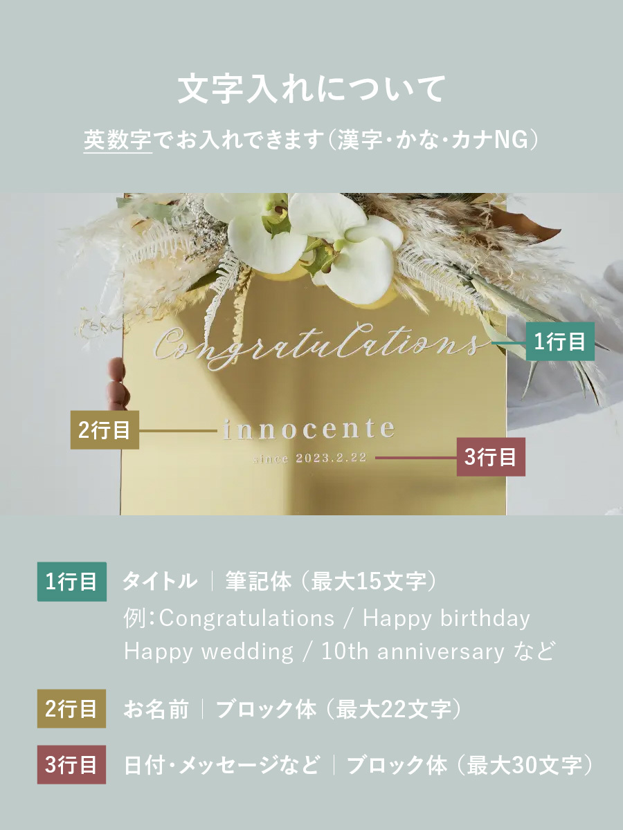 1行目は筆記体(最大15文字)、2行目はブロック体(最大22文字)、3行目はブロック体(最大30文字)となります。詳しくはこちら