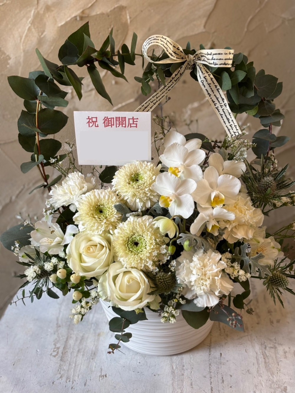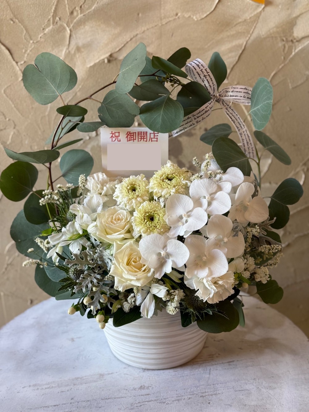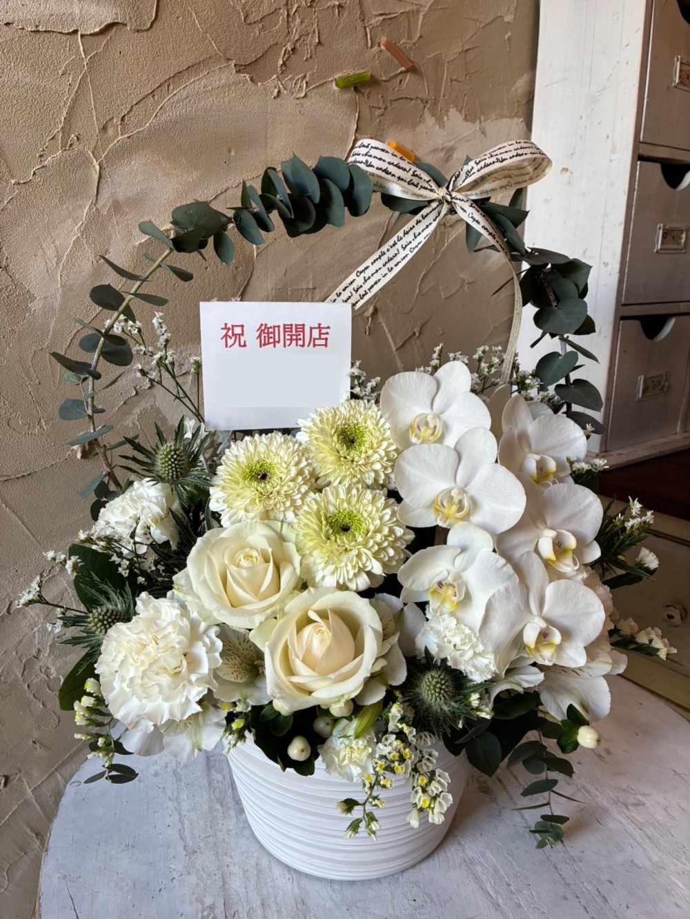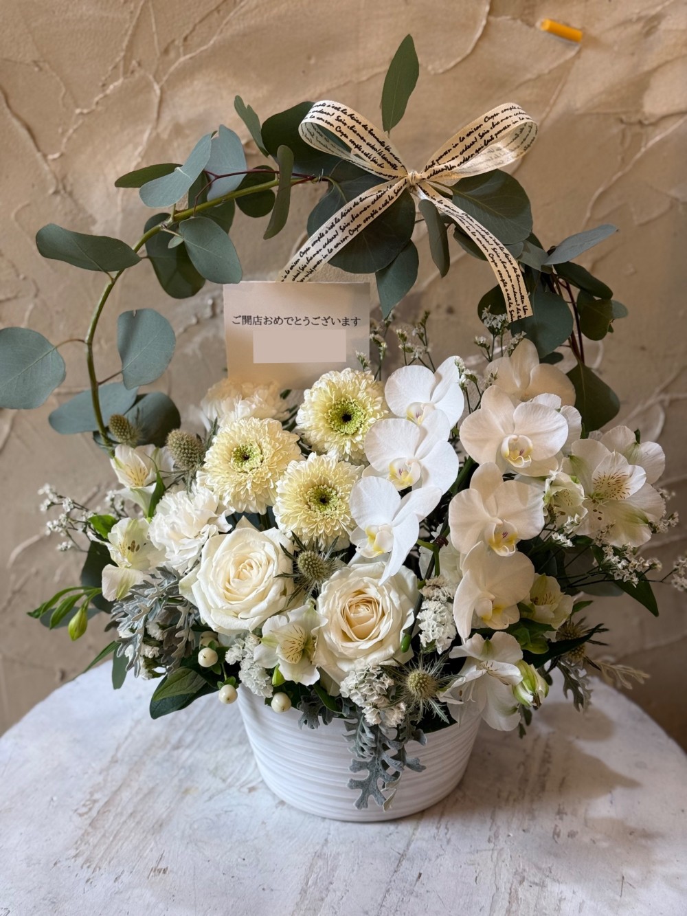 バラやガーベラなど白でまとめたナチュラルなアレンジに、胡蝶蘭をプラスして華やかにデザインしました。これからのご活躍、商売繁盛、幸せな未来への架け橋になるように、そんな想いをアーチに込めてお作りいたします。