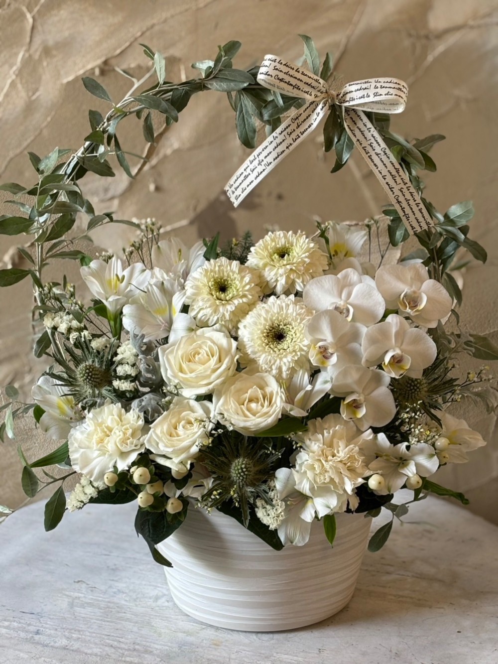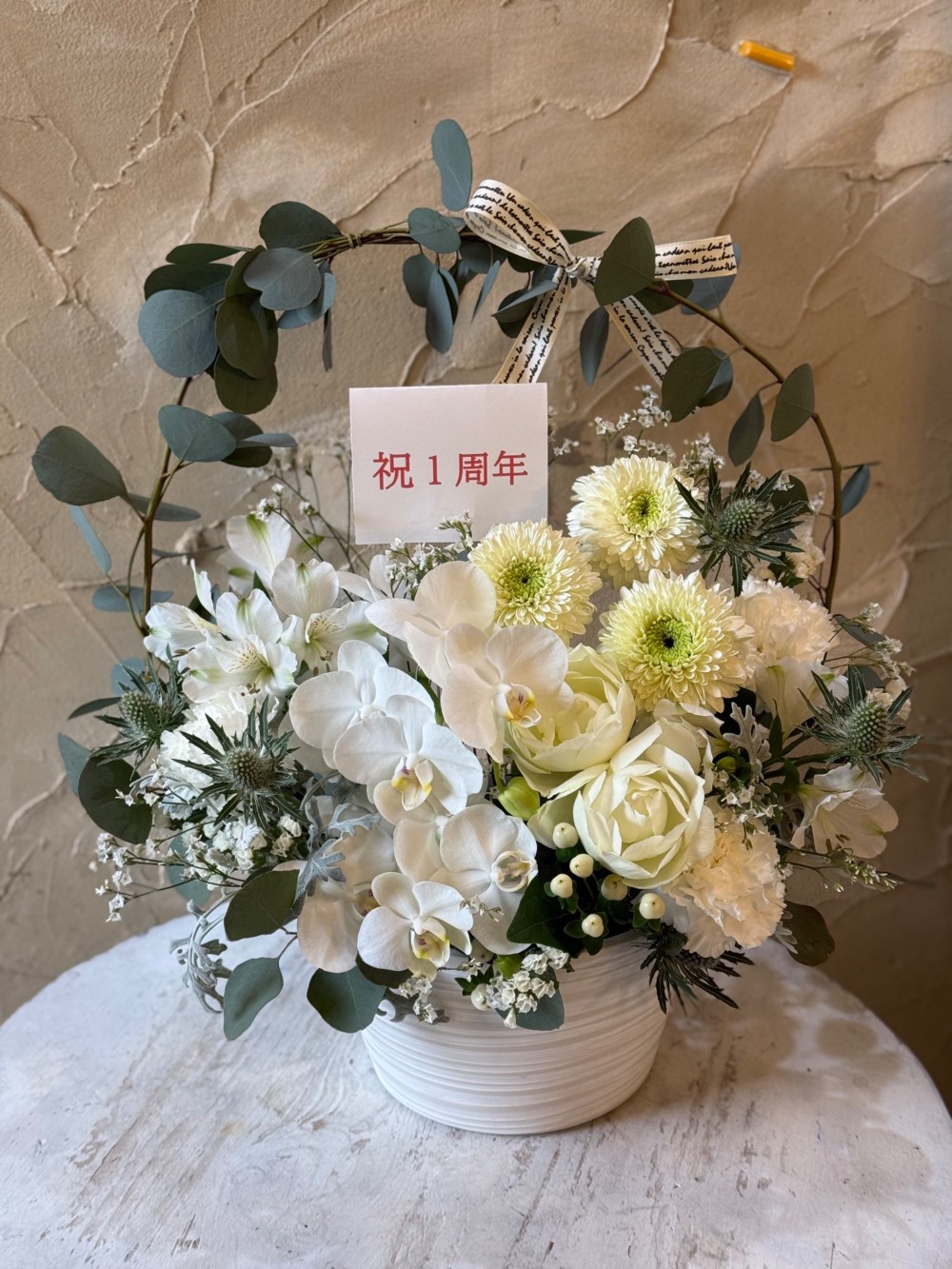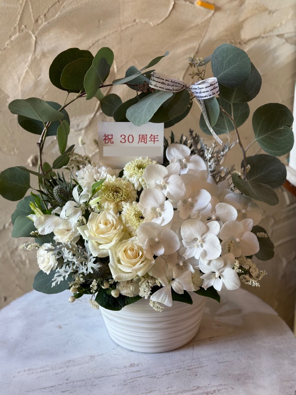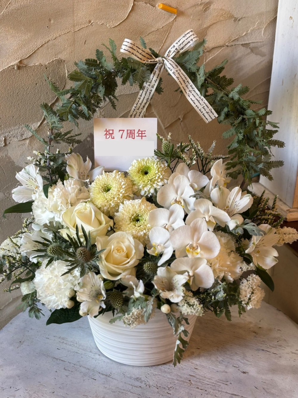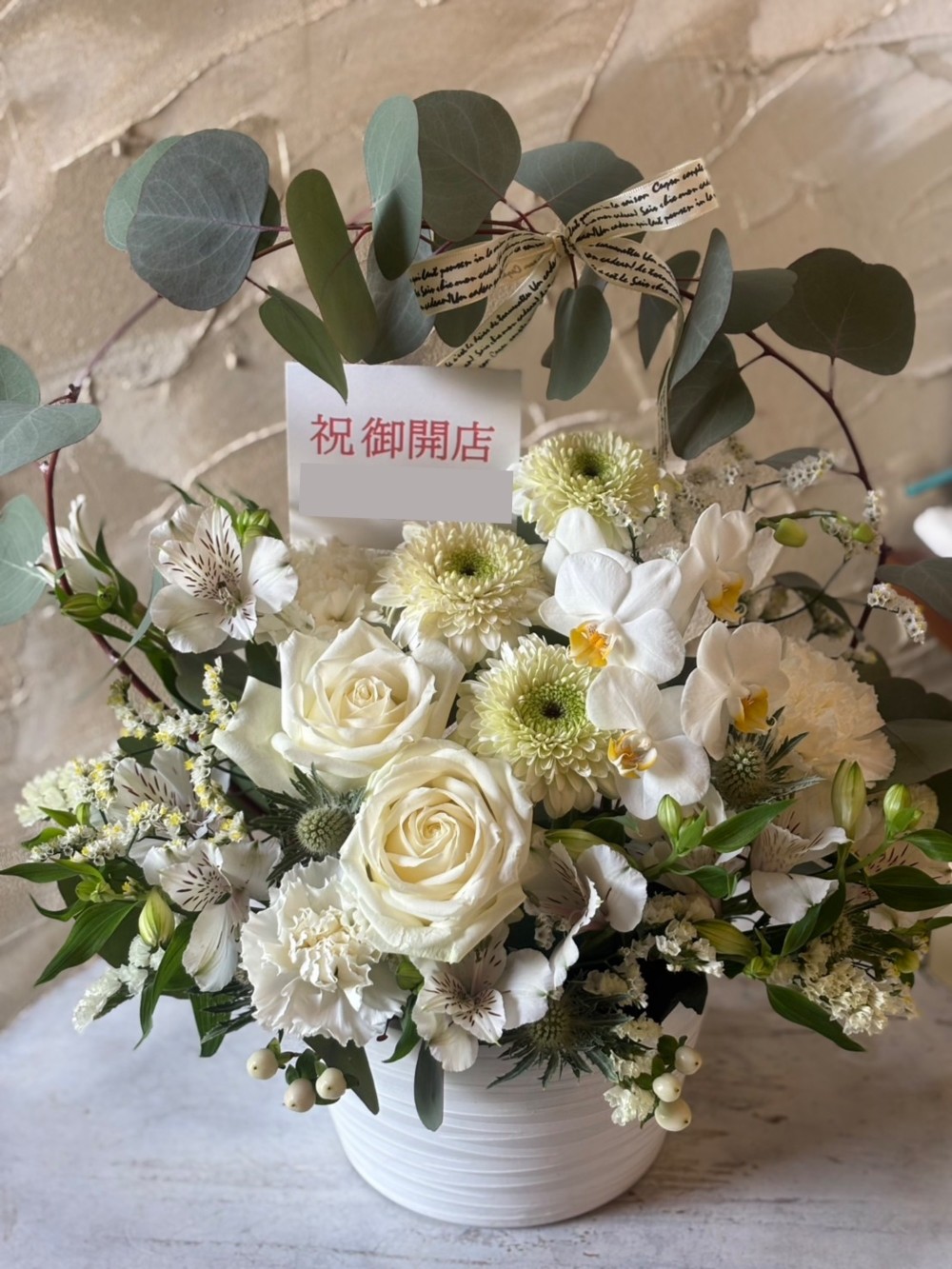 バラやガーベラなど白でまとめたナチュラルなアレンジに、胡蝶蘭をプラスして華やかにデザインしました。これからのご活躍、商売繁盛、幸せな未来への架け橋になるように、そんな想いをアーチに込めてお作りいたします。