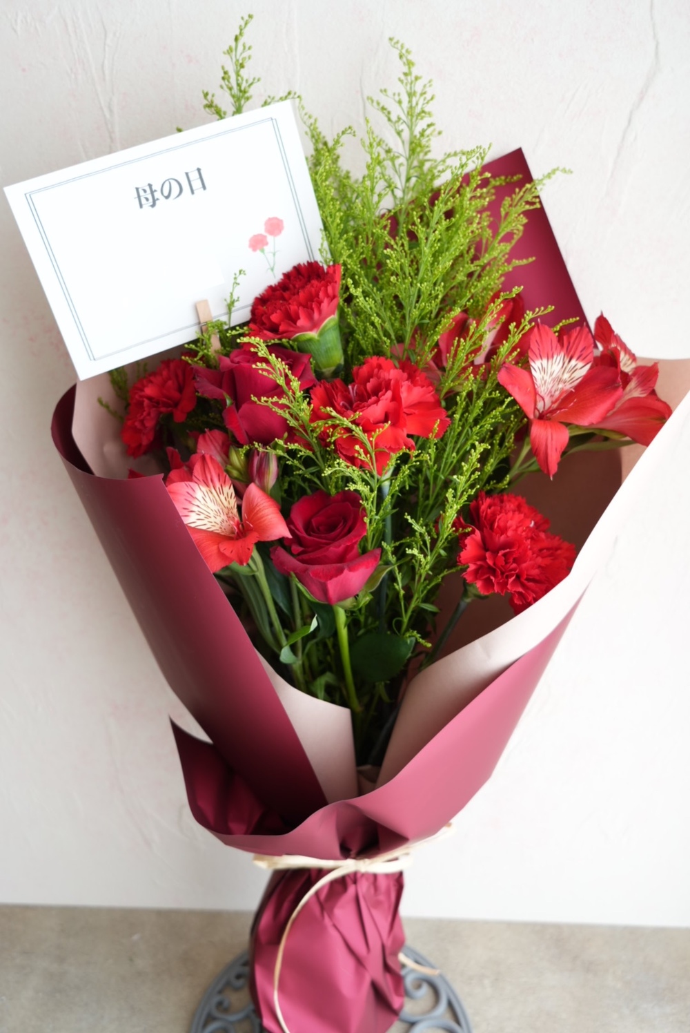 フラワーデザイナー成田愛恵が、旬のお花をメインに、その魅力を引き立てる色味の花材や瑞々しいグリーンを組み合わせた、特別な花束をご提案します。 季節ごとに移り変わるお花の表情を楽しんでいただけるのはもちろん、届いた瞬間にふわっと広がるフレッシュな香りも、心を癒すひとときに。 赤を基調とした花束は、華やかで情熱的な雰囲気が魅力です。 大切な方へのギフトにはもちろん、自分へのご褒美やお部屋の彩りにもおすすめです。 飾るだけで、空間が華やぎ、心が豊かになる花束をぜひお楽しみください。