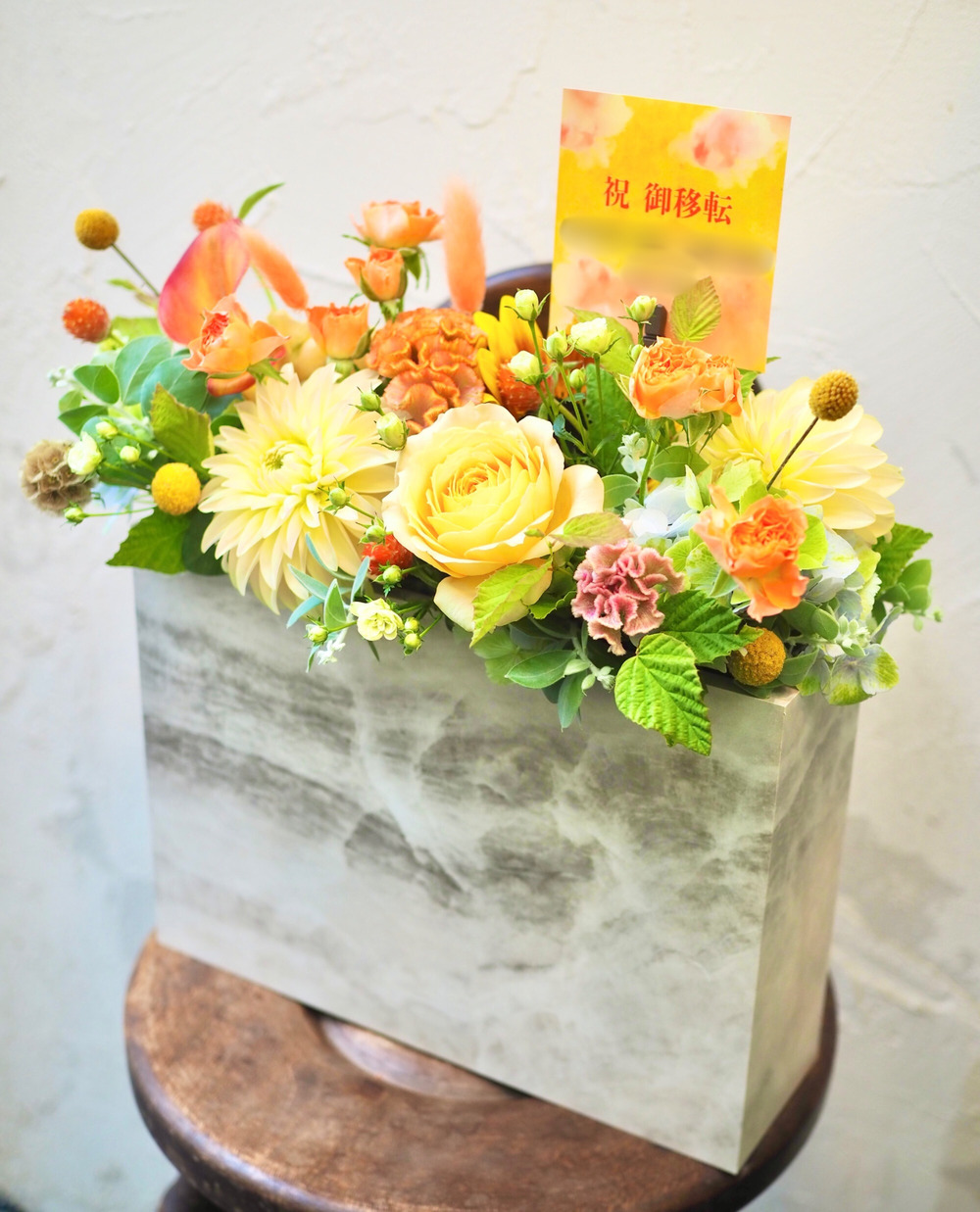 上品な大理石柄のベースに、フラワーデザイナー後藤亜希子がおまかせでお作りする季節の生花アレンジです。見た目は高級感のある大理石風ですが、素材は木製なのでとても軽く、気軽に飾っていただけるのが魅力。落ち着いた雰囲気と軽やかさを兼ね備えた、贈り物にもご自宅用にもおすすめのフラワーギフトです。お花は旬のものをふんだんに使い、花材の動きや表情をいかしたナチュラルで洗練されたデザインに仕上げます。蕾が開くことで少しずつ姿が変わり、日々の変化を楽しんでいただけます。
