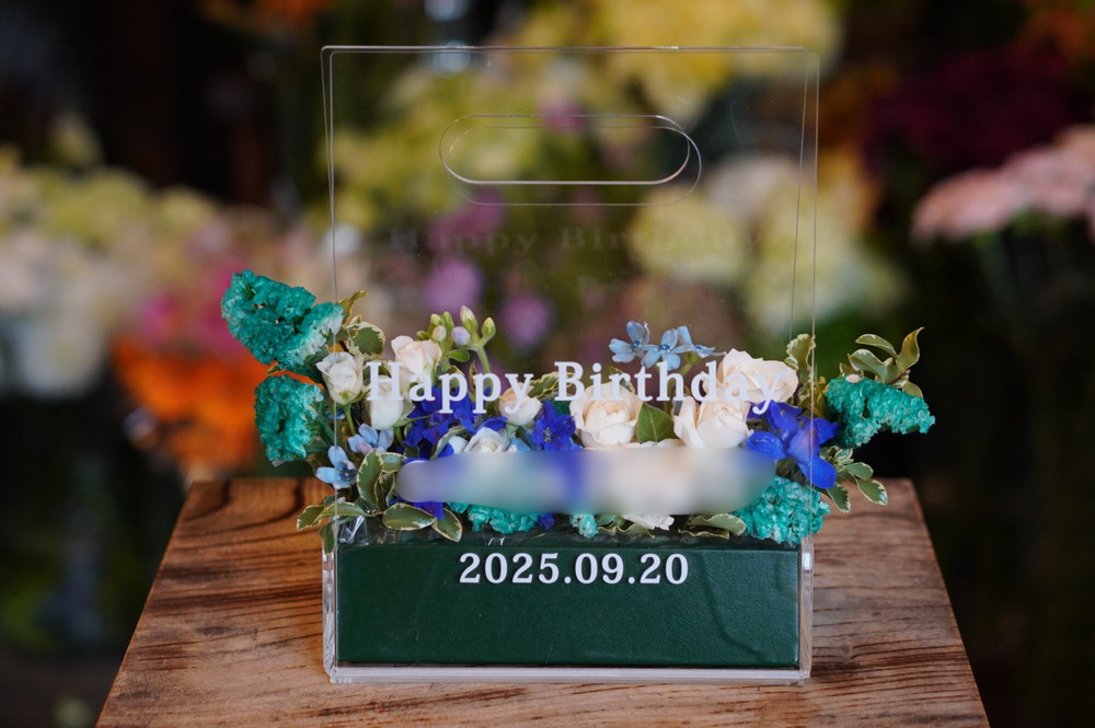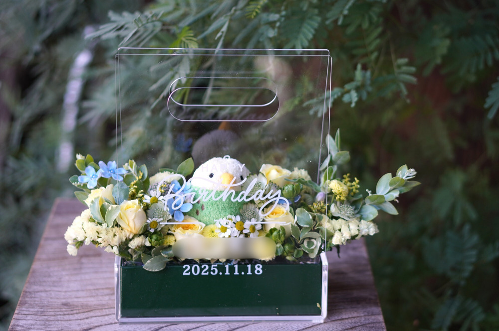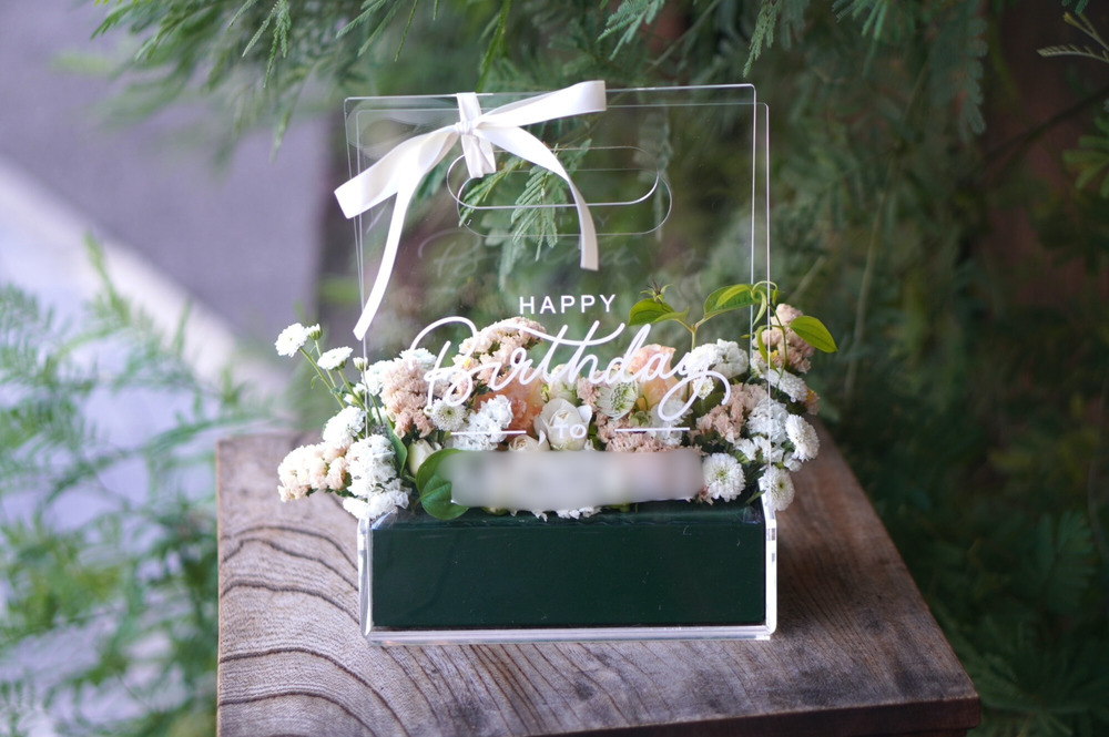 アクリル素材のクリアトートに、お好きな色味でお花をアレンジ。上品でスタイリッシュなデザインは、開店祝いや周年祝い、昇進祝いなど、さまざまなお祝いシーンにぴったりです。クリアトートには、店名やお名前、日付などの文字入れが可能。お花を楽しんだあとは、小物入れやディスプレイとしても活用できます。