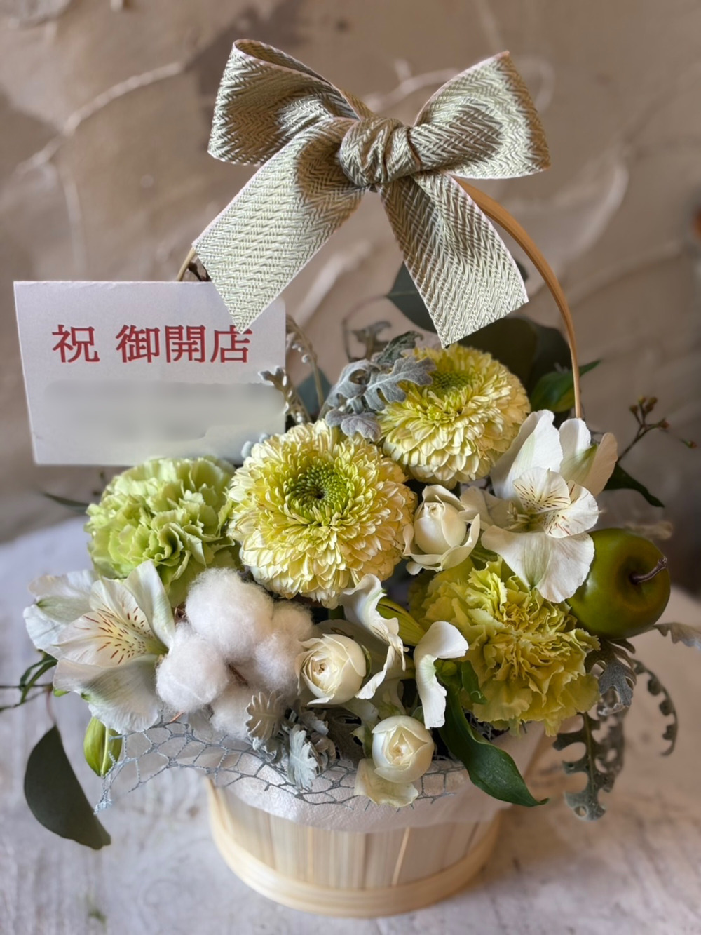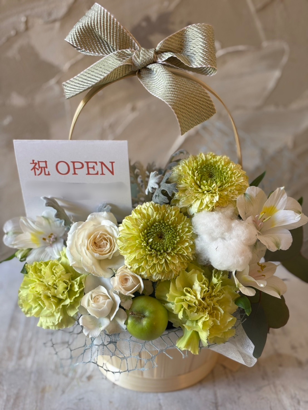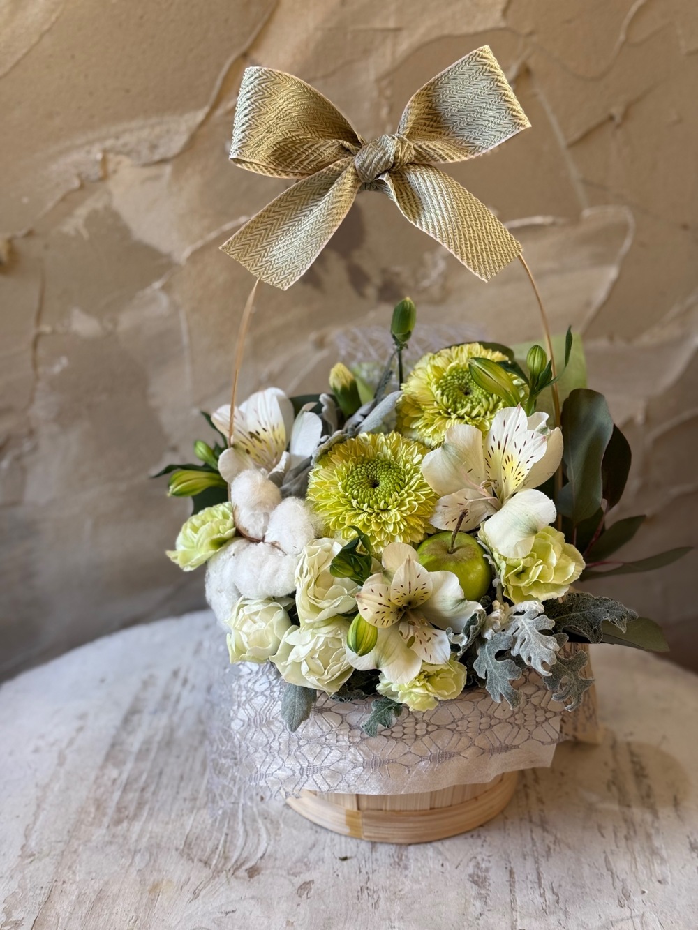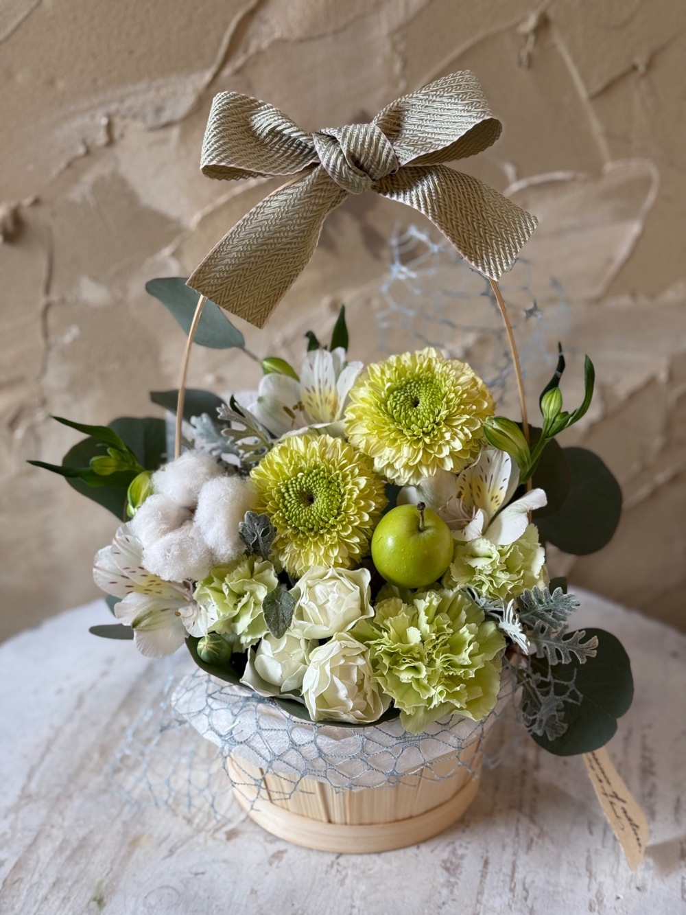 【冬限定】生花のリボンバスケットアレンジ ホワイトグリーン