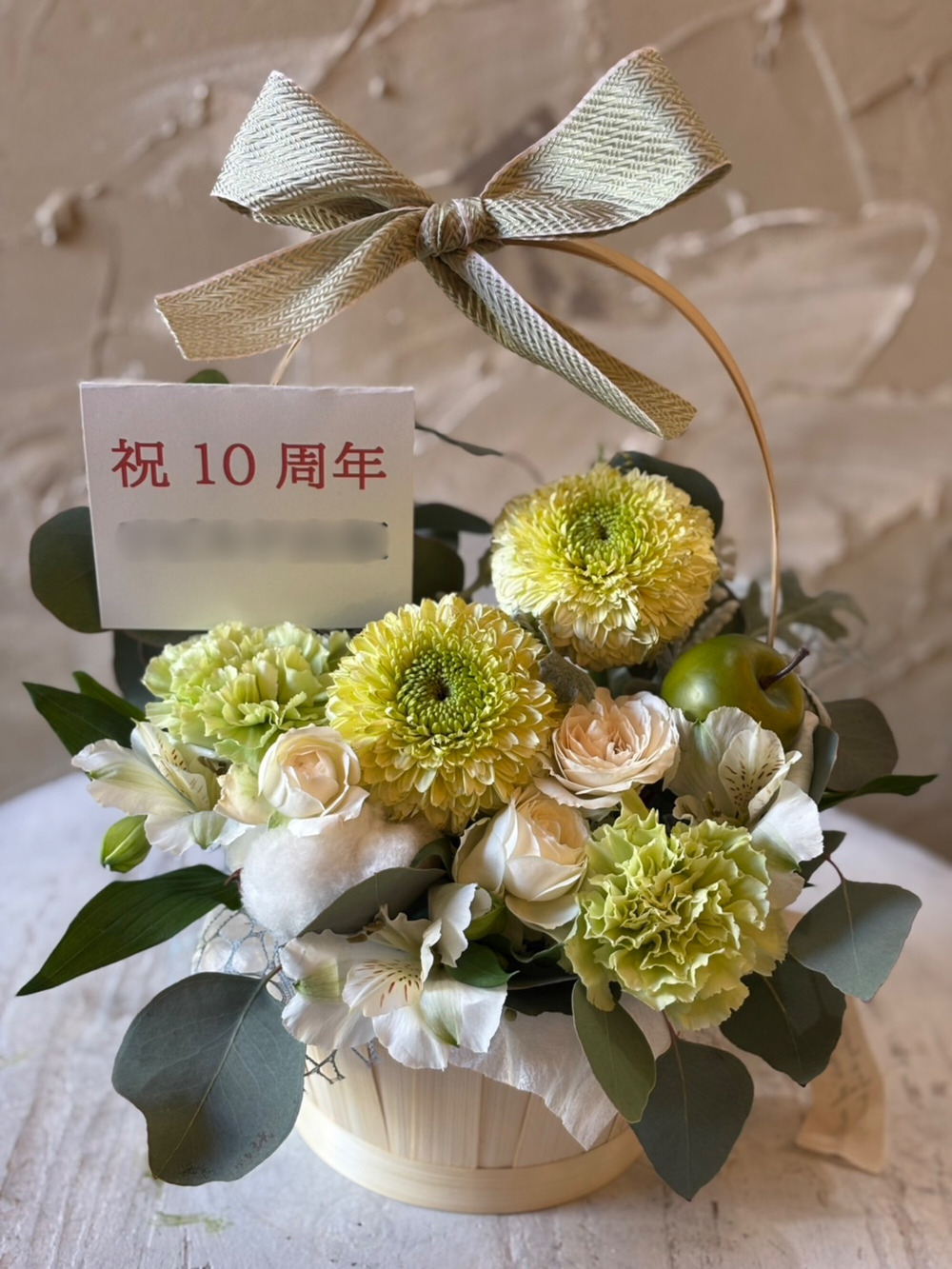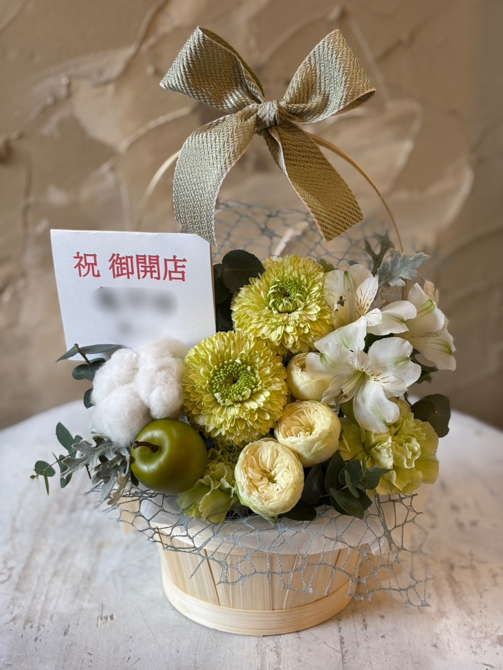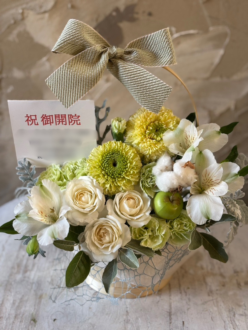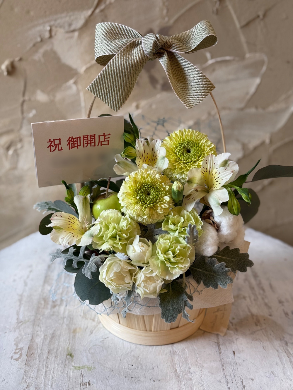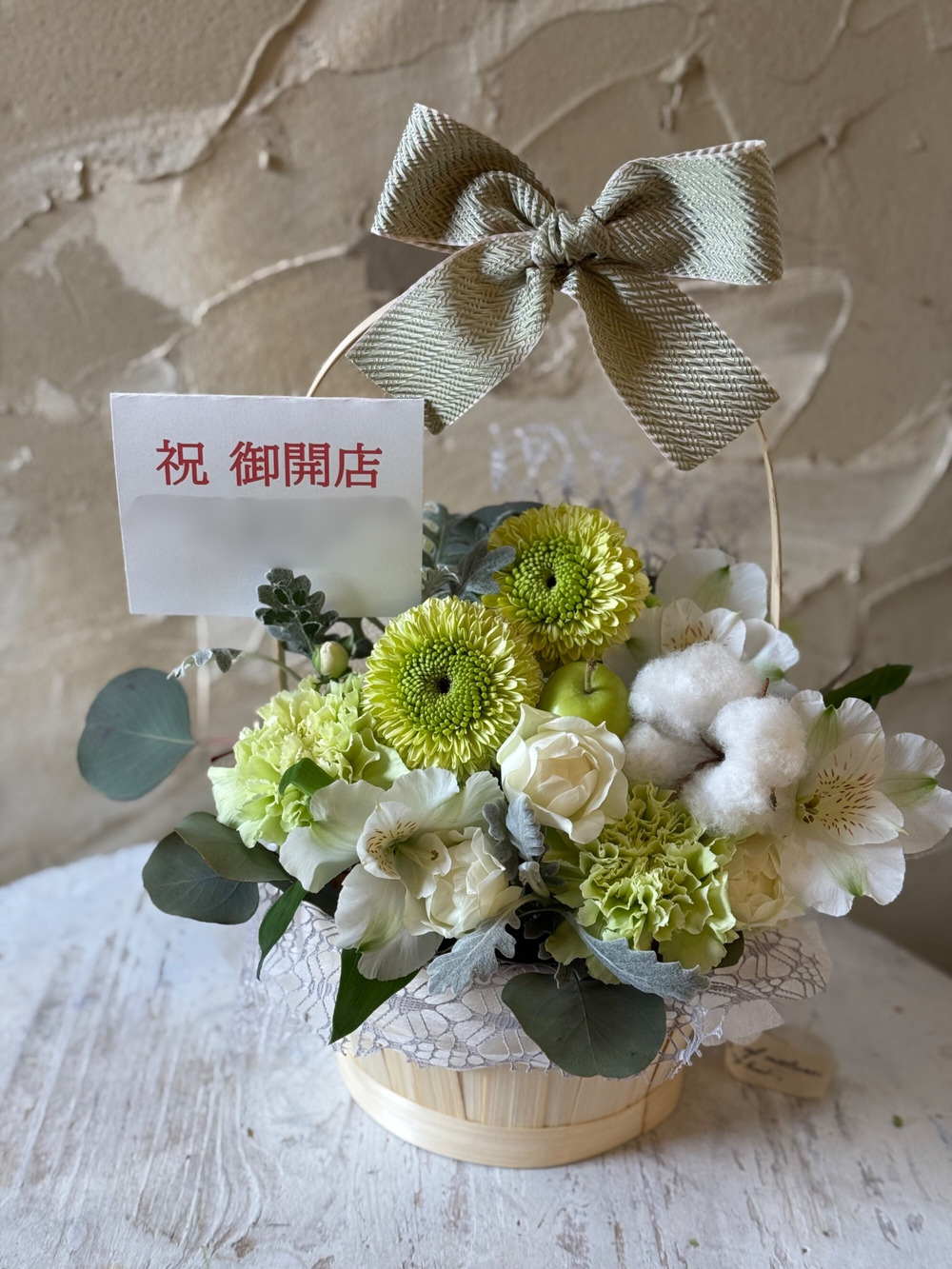 【冬限定】生花のリボンバスケットアレンジ ホワイトグリーン