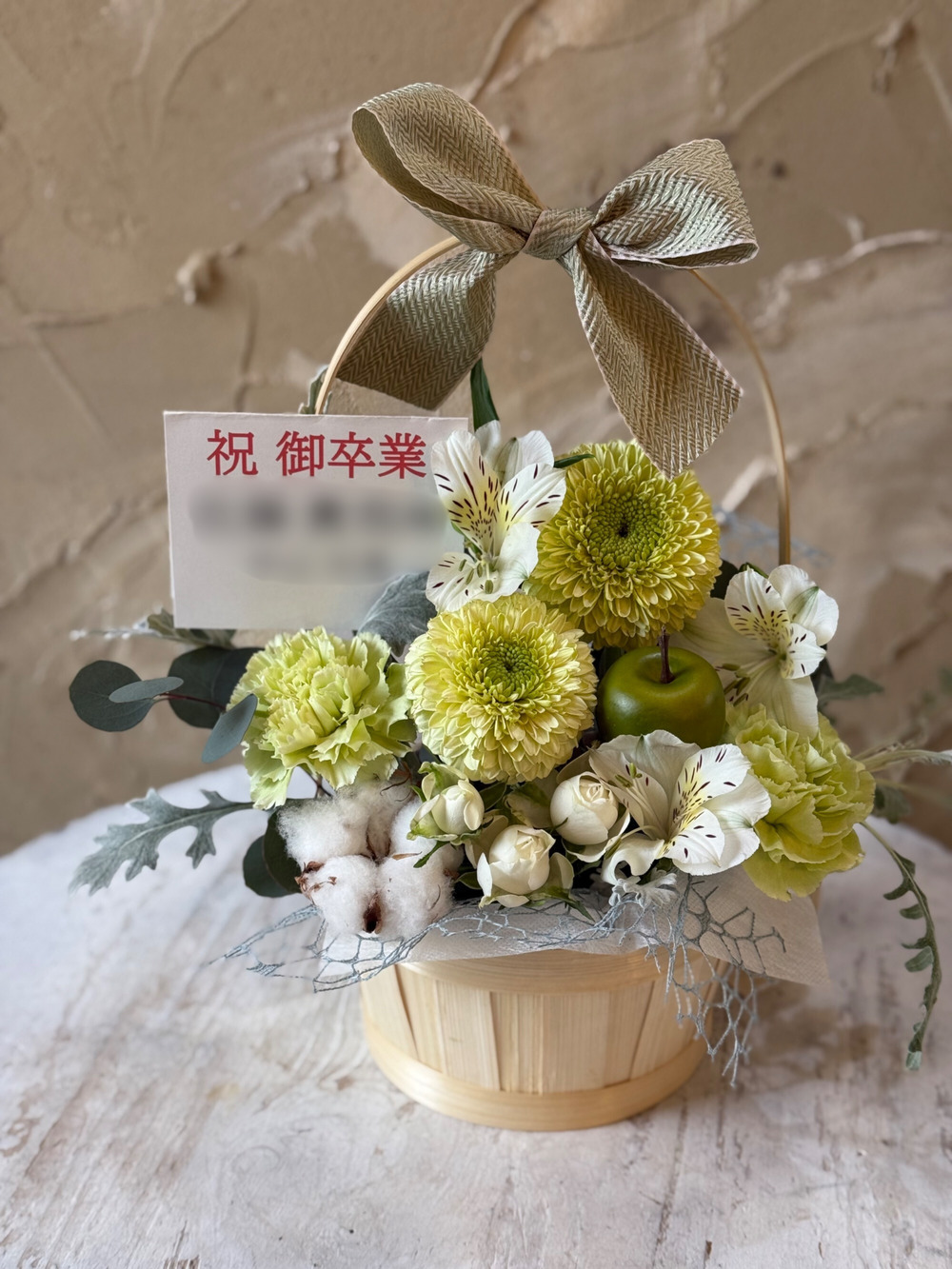 人気の八重咲ガーベラやバラをメインに、可愛らしいりんごやコットンを添えて、ナチュラル&爽やかな人気の色合いで冬らしくまとめました。ナチュラルカラーのリボンをあしらった手付きバンブーバスケットに、ころんとした可愛らしいフォルム。手に取るだけで心までほっと和むような、優しいアレンジです。※リボンの廃盤が決まってしまったため、ご注文のタイミングによっては色や太さが変更になる可能性がございます。※立て札をご自身でご用意いただく場合はハガキ半分のサイズでご用意をお願いします。