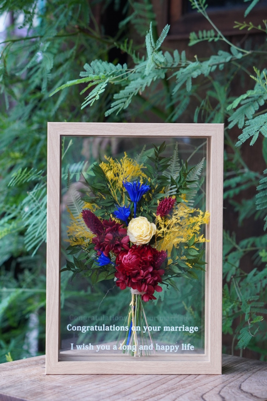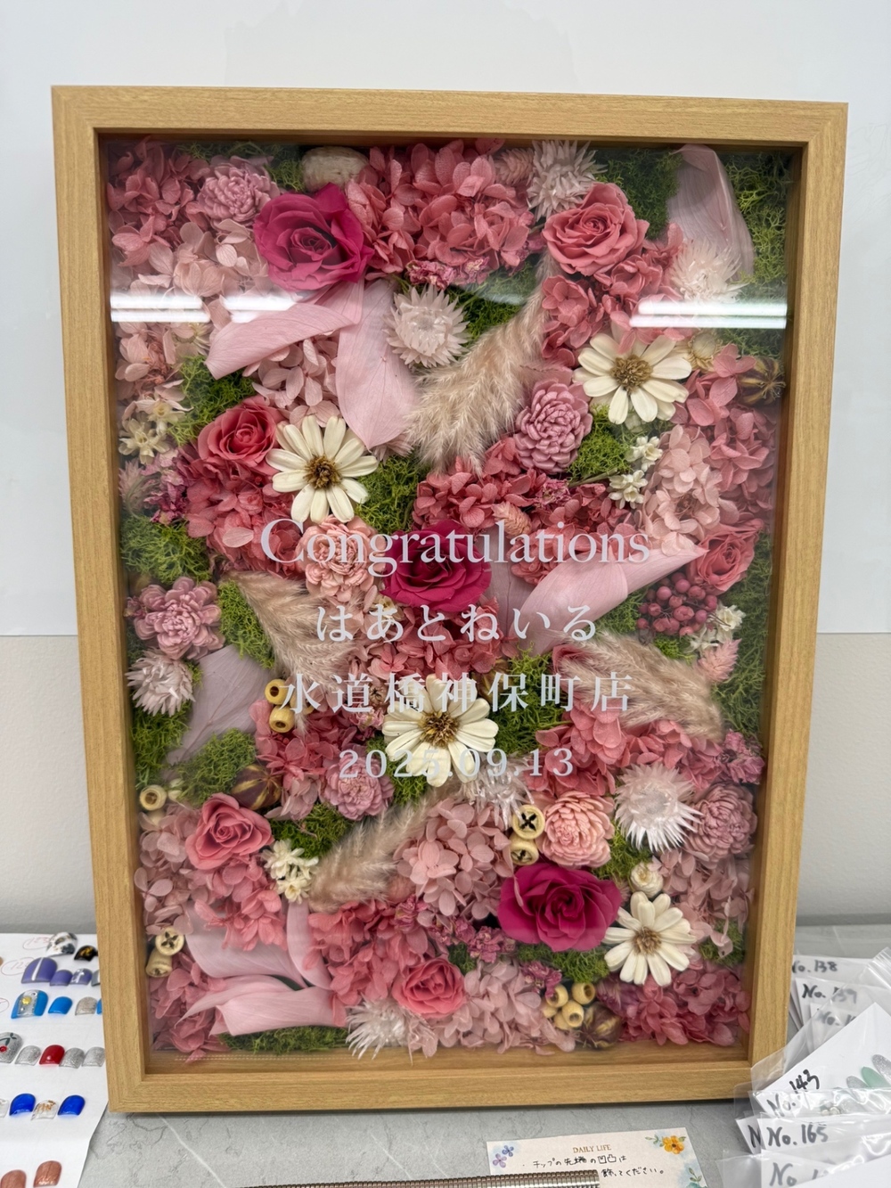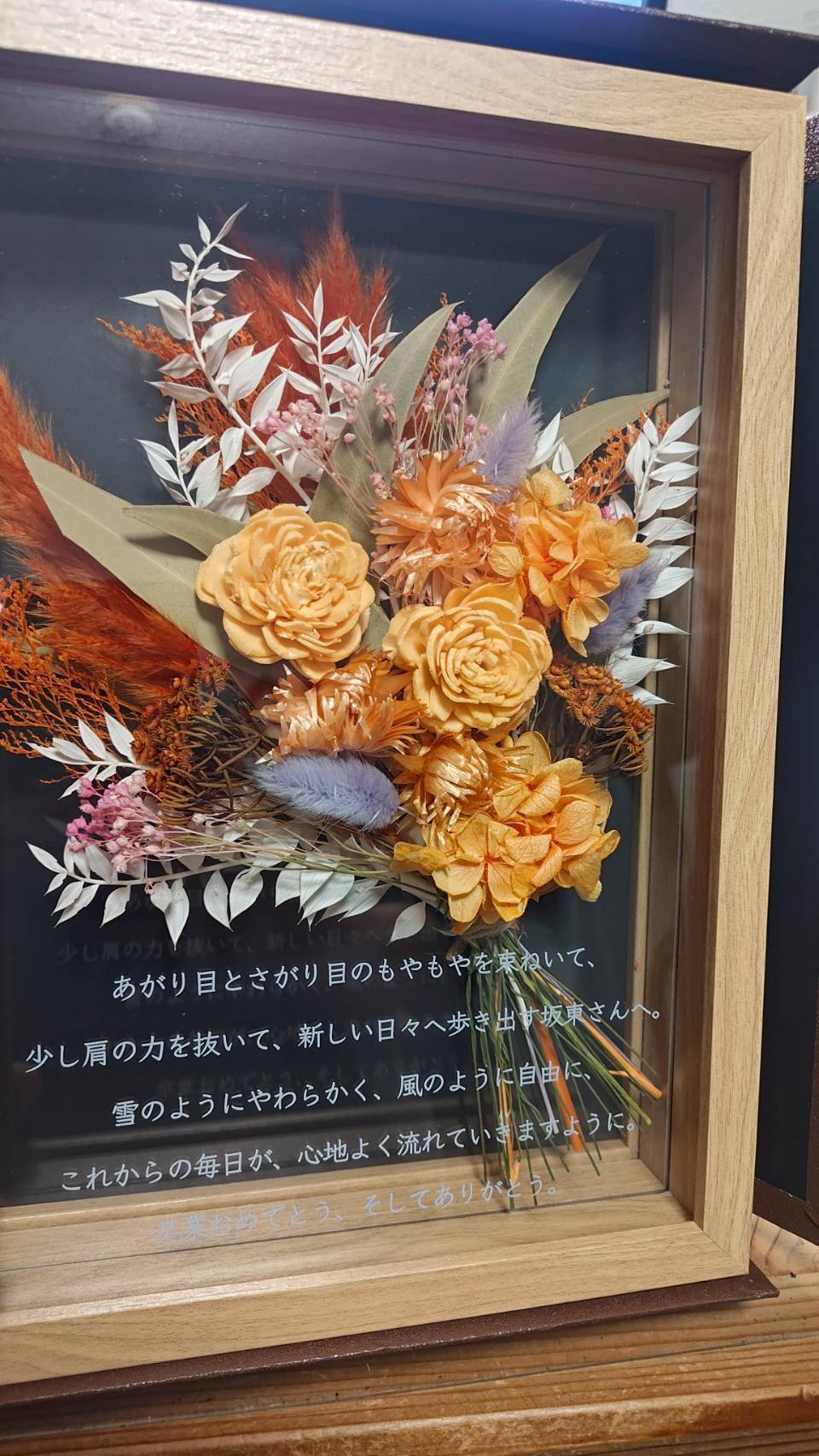 お花のキレイさも名前入りもものすごく喜んでもらい、目立つところ、どこへ飾ろうかと言って頂き、選んだ甲斐がありました。