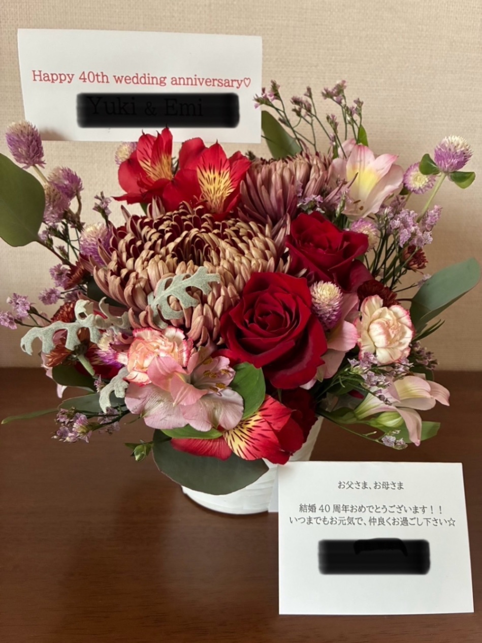 赤をベースに、そしてピンクなどの明るい色を入れてほしいと希望を出したところ、それ通りのアレンジをして頂き大変満足しております。