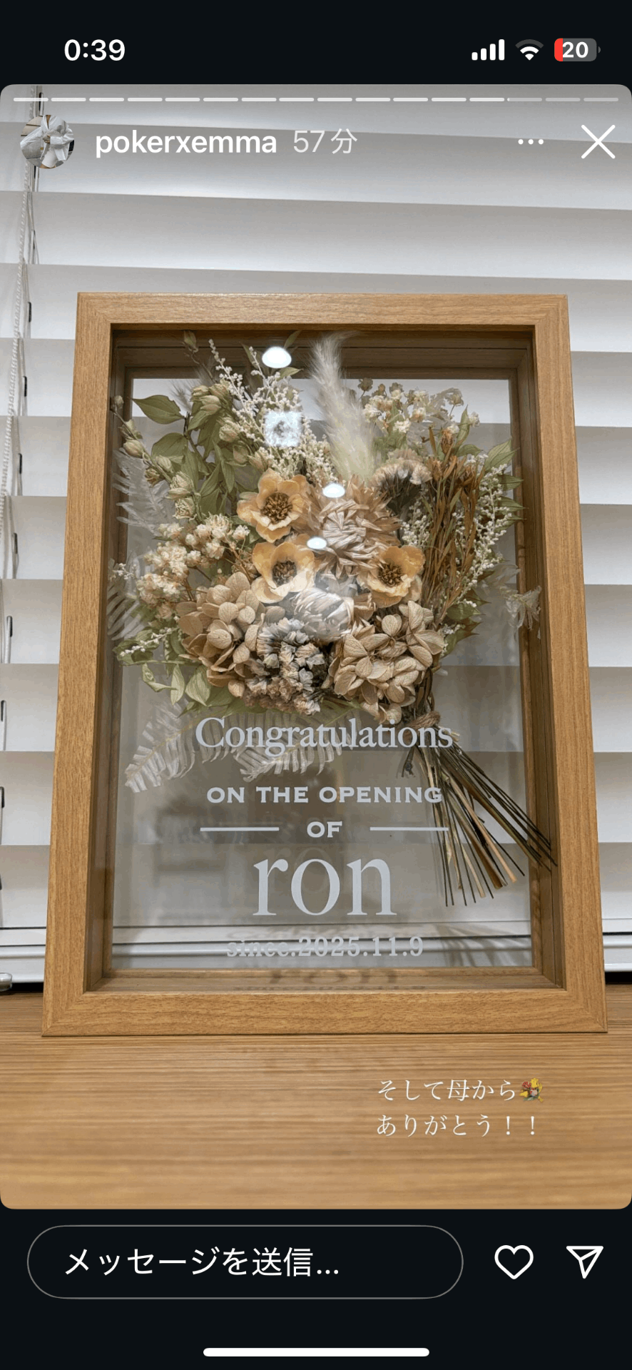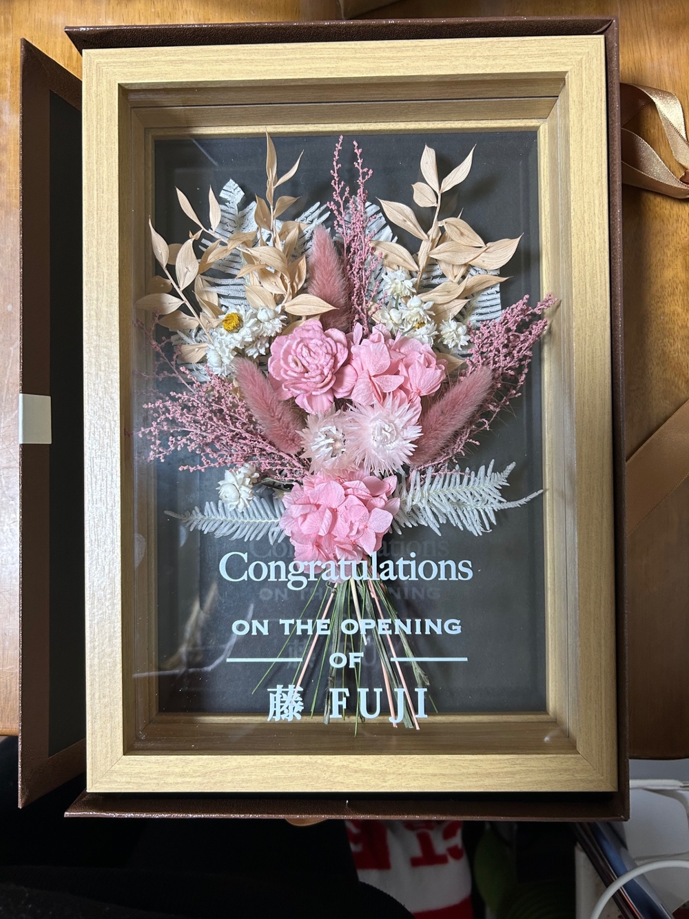 先日やっと実物を自分の目で見てくることができたのですが、お花がふんだんに使われておりとてもボリュームがあって、他の祝花にも負けないくらいとても存在感がありました。