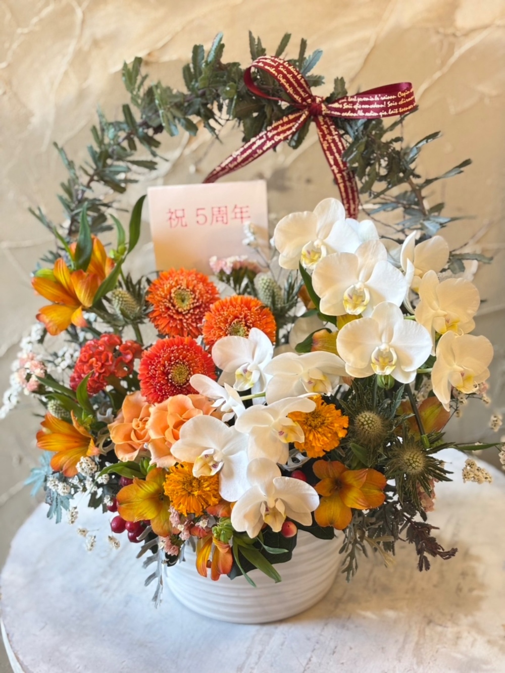 秋を感じられる季節感溢れる素敵なお花で、個展にも合っていたように感じました。BOXタイプだったので手に取りやすいサイズでご本人にも喜んでいただけました。ありがとうございました。オリジナルで作りたかったのですが、時間がなくて直ぐに注文出来るこちらを選ばせて頂きました。お値段以上のボリュームで大満足です。