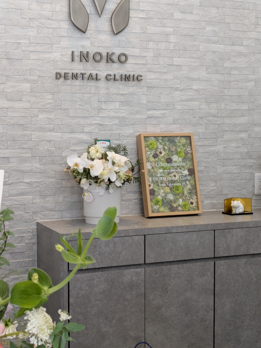 小さな菓子店なので、小振りなお花で正解でした。他のお客様の祝花はみな大きくて、店外の足元に置かれていましたが、私のお花が1番小さく、店内のカウンターに置いて頂きました!小振りでもグッと店内が華やかになったのを感じました。白が基調の店内なので、お客様の目がお花よりまず先に商品に行くように、主張し過ぎない白いお花を選びました。さりげなく店内に溶け込み、かつ、お花にグリーンも多く入っているので、みずみずしくフレッシュで、新たなオープンの喜びを演出できたと思います。これも本当に素敵なデザインのお花のお陰です。ありがとうございました!!