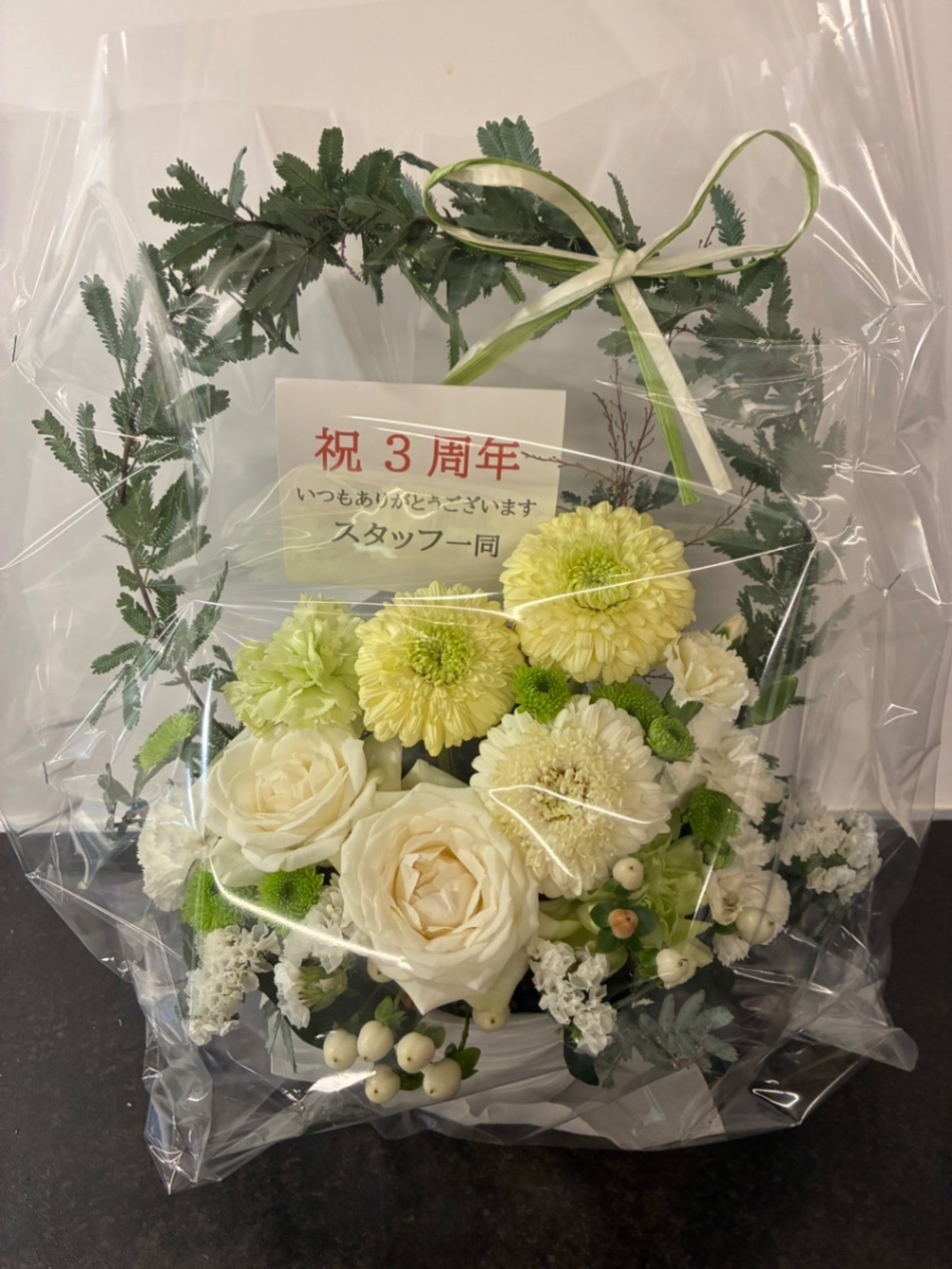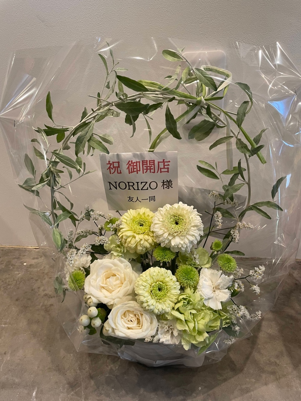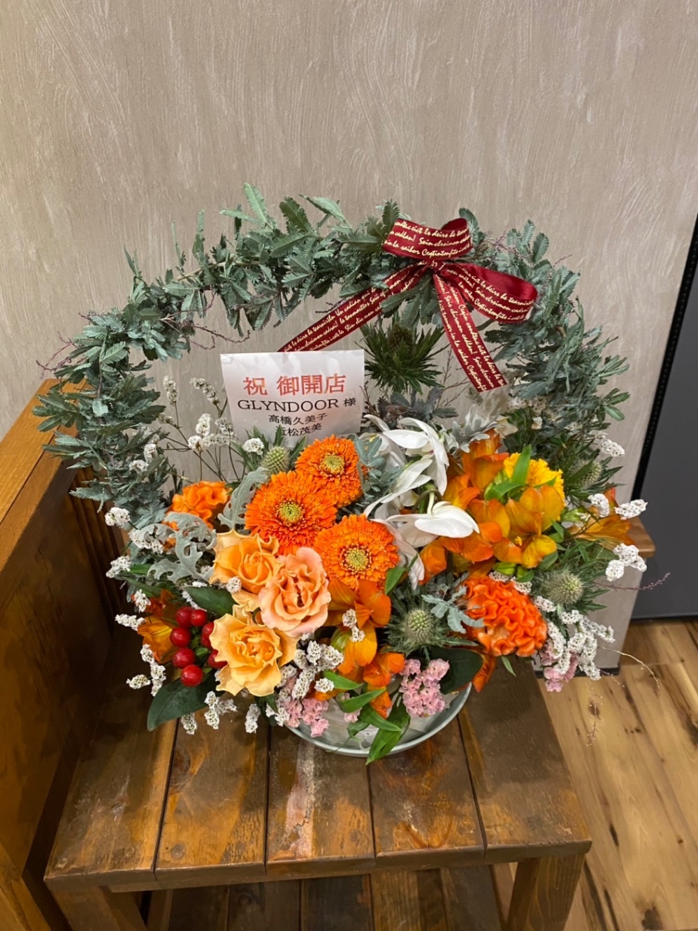 この度は素敵なデザインのお花を作っていただきありがとうございました。当日友人の店舗に伺いまして、実物も見てきましたが、ナチュラルな色合いがお店の雰囲気に合っていて、友人もとても気に入って飾ってくれていました。わたしのお気に入りポイントはアーチの部分です。アーチがあることで華やかさがありました。また配達料も含めてお値段もとてもリーズナブルでした。