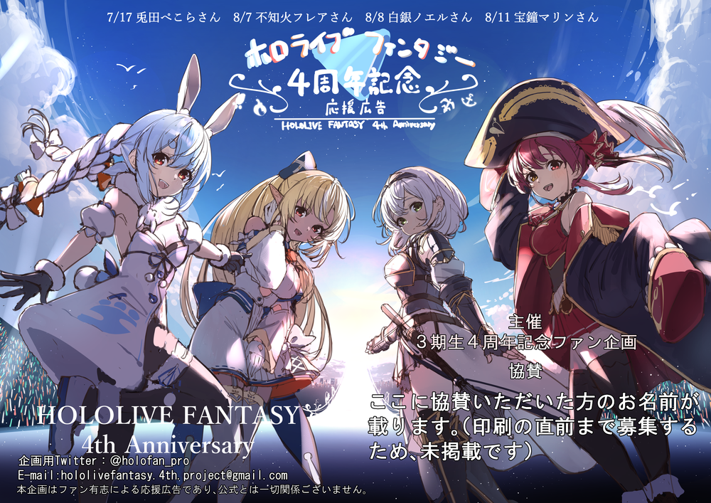 そんなホロライブ所属の3期生である「兎田ぺこらさん」「白銀ノエルさん」「不知火フレアさん」「宝鐘マリンさん」へ活動4周年記念に掲載された応援広告のノウハウや主催者様の今回の企画への想いをご紹介していきます!