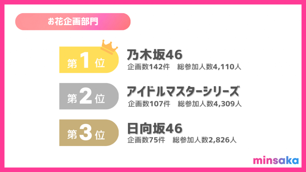 お花贈り企画部門では坂道シリーズである乃木坂46の皆さんへのお花企画が第1位、日向坂46の皆さんへのお花企画が第3位となりました!