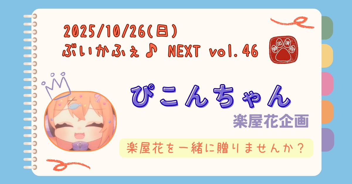 「ぶいかふぇ♪NEXT vol.46」にご出演予定のぴこんちゃん様宛に、お祝いの楽屋花を贈りませんか?Seeking support to send flowers to her for Vcafe♪NEXT vol.46 (Oct 26)