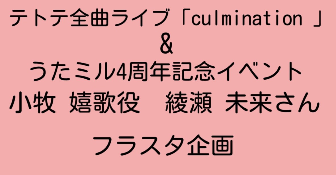 テトテ全曲ライブ「culmination」、うたミル4周年記念イベント 小牧嬉歌役綾瀬未来様へのフラスタ企画