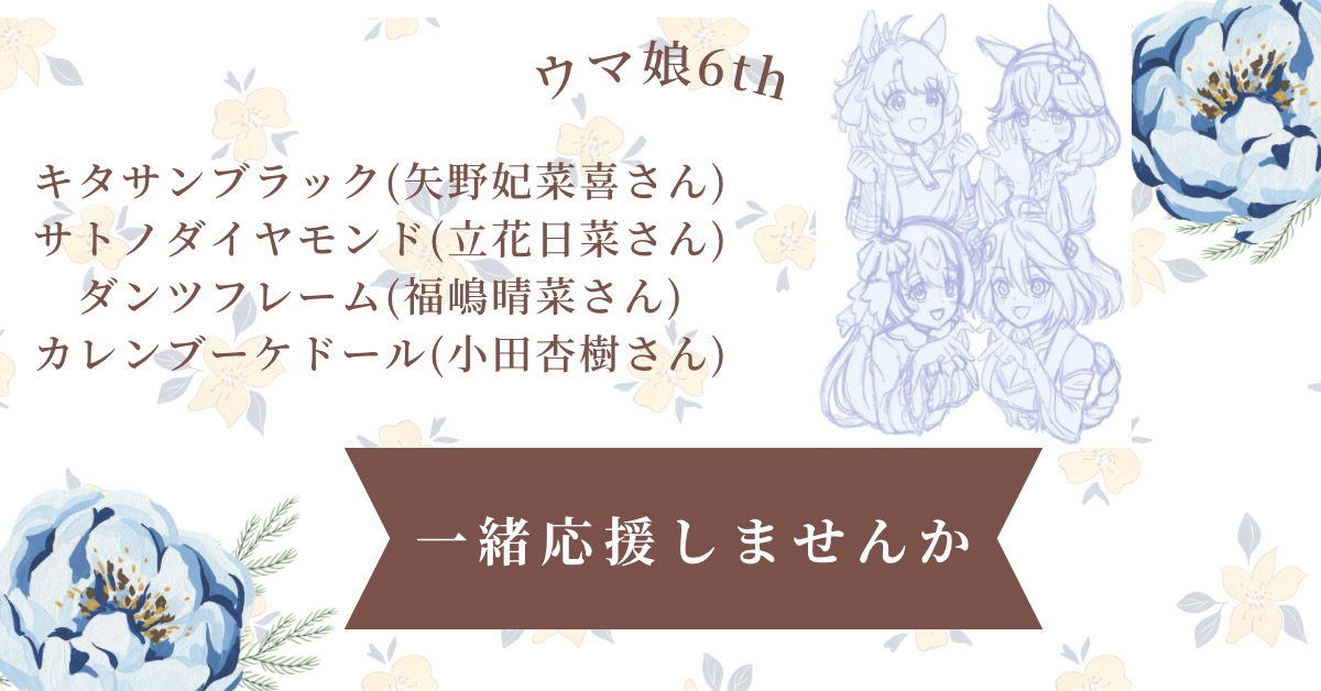 ウマ娘は6th、キタサンブラック役(矢野妃菜喜さん)、サトノダイヤモンド役(立花日菜さん)、ダンツフレーム役(福嶋晴菜さん)、カレンブーケドール(小田杏樹さん)に素敵なお花を贈りませんか?