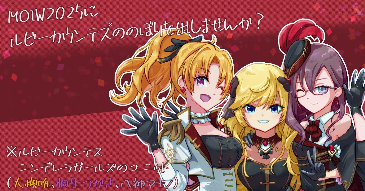 THE IDOLM@STER M@STERS OF IDOL WORLD 2025に、アイドルマスターシンデレラガールズのユニット「ルビーカウンテス(大槻唯、桐生つかさ、八神マキノ)」ののぼりを出しませんかという企画になります。