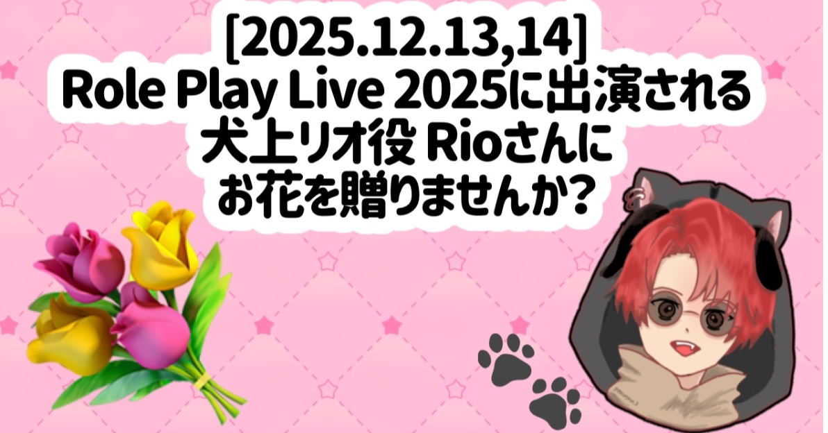 12/13,14に開催されるRole Play Live 2025に出演される犬上リオ役 Rioさんにフラワースタンドを有志の方々と一緒に贈りたいと思っています。観測者さんでもそうでなくても、Rioさんのことが好きな人たち集まれ〜!
