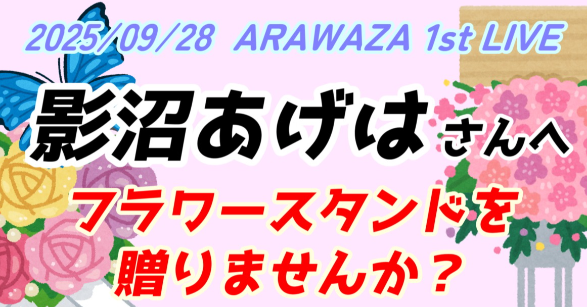 2025年9月28日の ARAWAZA 1st LIVE " START TUNE " にて 影沼あげは さんへフラワースタンドをお贈りする企画です。