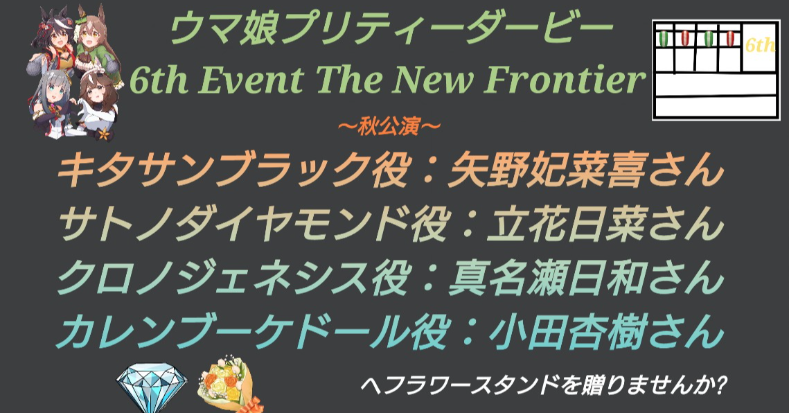 [ウマ娘6thEvent The New Frontier]にご出走されるキタサンブラック役矢野妃菜喜さん、サトノダイヤモンド役立花日菜さん、クロノジェネシス役真名瀬日和さん、カレンブーケドール役小田杏樹さんへフラスタをお贈りする企画です。