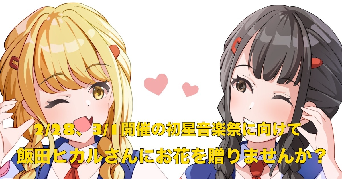 2/28,3/1に開催される初星音楽祭に出演される飯田ヒカルさんへ、お花を贈りたいと思います。フラスタ、楽屋花はどちらもNGということなので、事務所宛にお花を贈りたいと思います。お花のレギュレーションについてはその他をご覧下さい。