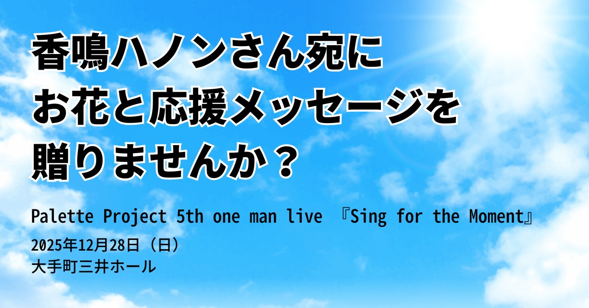 2025年12月28日に開催されるPalette Project 5th one man live 『Sing for the Moment』にて香鳴ハノンさん宛にフラワースタンドおよび応援メッセージを贈る企画です。