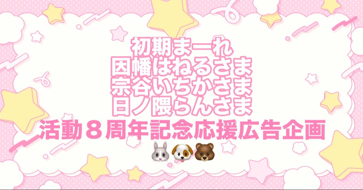 活動8周年を迎える初期まーれ(因幡はねる様・宗谷いちか様・日ノ隈らん様)の皆様へ応援広告を贈りたい!という企画です。