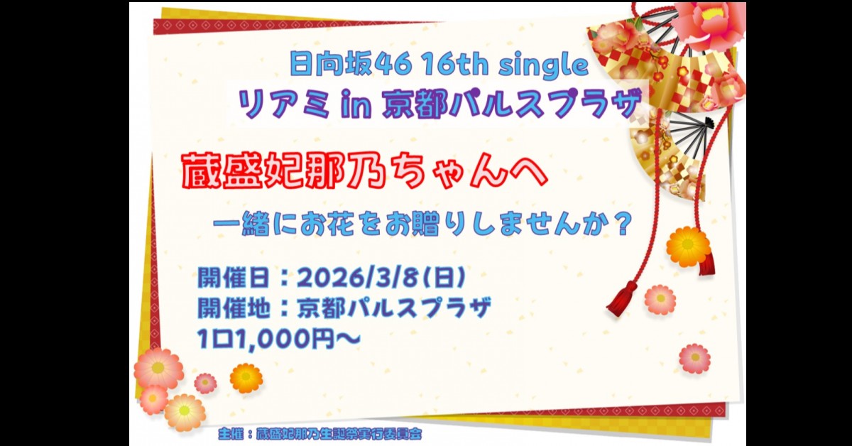 3/8に京都パルスプラザにて行われるリアルミート&グリートで蔵盛妃那乃さんへ祝花をお贈りいたします。