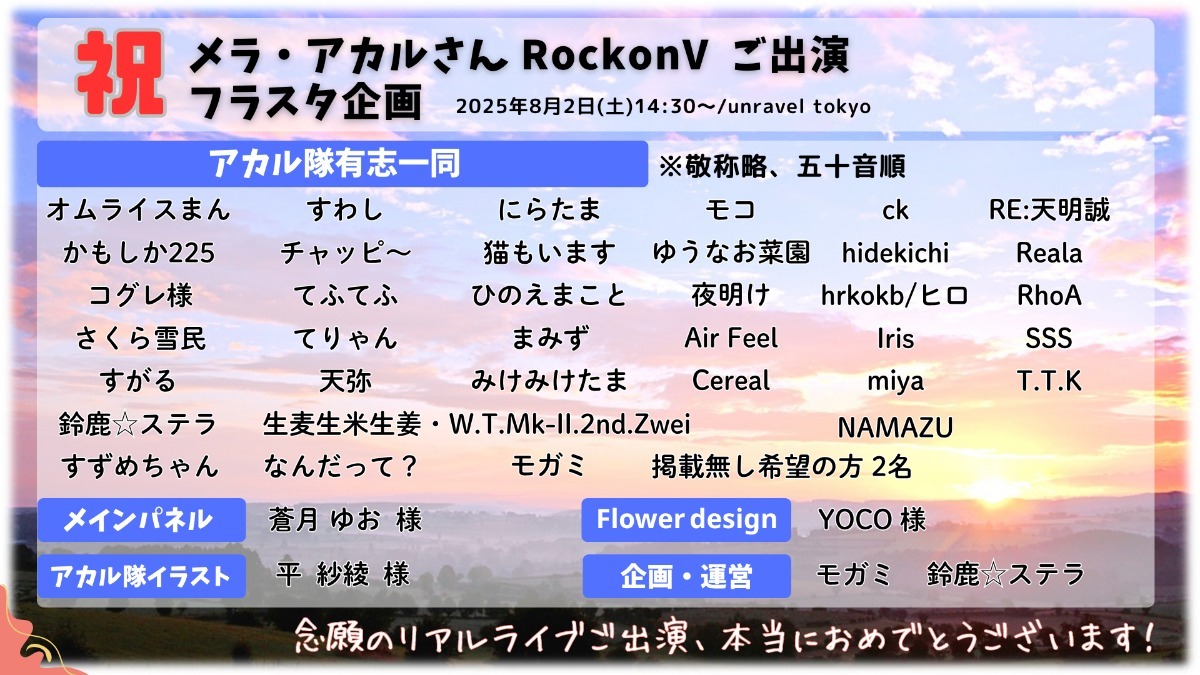 【メラ・アカル🔥🔺フラスタ】8/2開催のRockonVにご出演されるメラさんへ、みんなでお祝いのお花を贈りませんか?