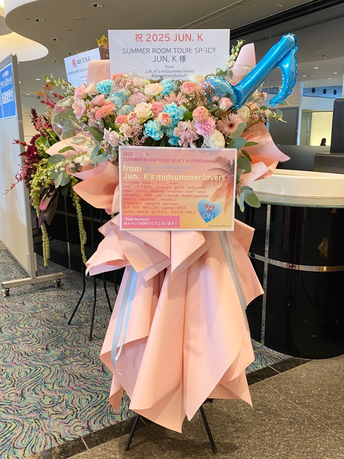 ジュンケイさんに私達の大きな愛を形にしたく、フラワーデザイナーさんとやりとりをしながら出来上がりました!メンバーカラーのピンク色をメインにしたとても美しい夏のサンセットを感じるような、素敵なフラワースタンドになりました♡ネームボードで9月のカムバのお祝いの言葉を入れることも出来、よかったです。沢山のご参加ありがとうございました。掲載と報告遅れて申し訳ございません。