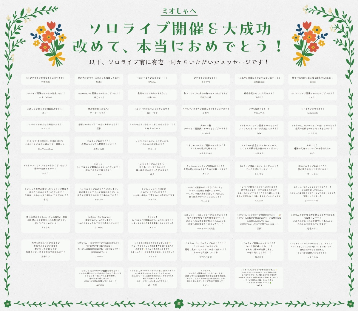 せっかく皆様に想いを込めて書いていただいたため、ライブ後となりますが、なんらかの形(デジタル色紙など)でSNS上で発信できればと思います。
