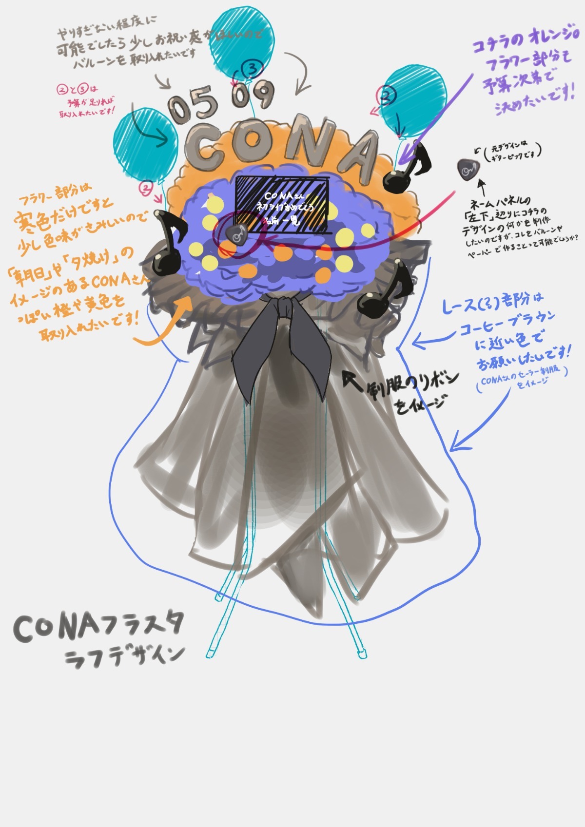 企画概要の方で提示したコンセプト通り、こなさんの好きな青の花を中心にお祝い感を出せるように橙や黄色など夕焼け感のある色を差し色にいれて、こなさんをイメージしたフラスタのラフデザインを作成しました。