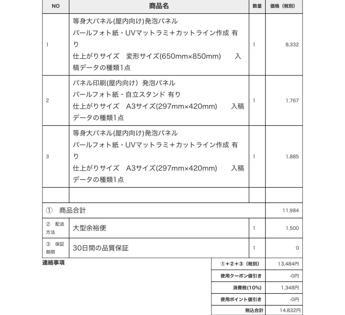 メインパネル、名簿パネル、応援パネル。3つのパネルの注文が完了しました。