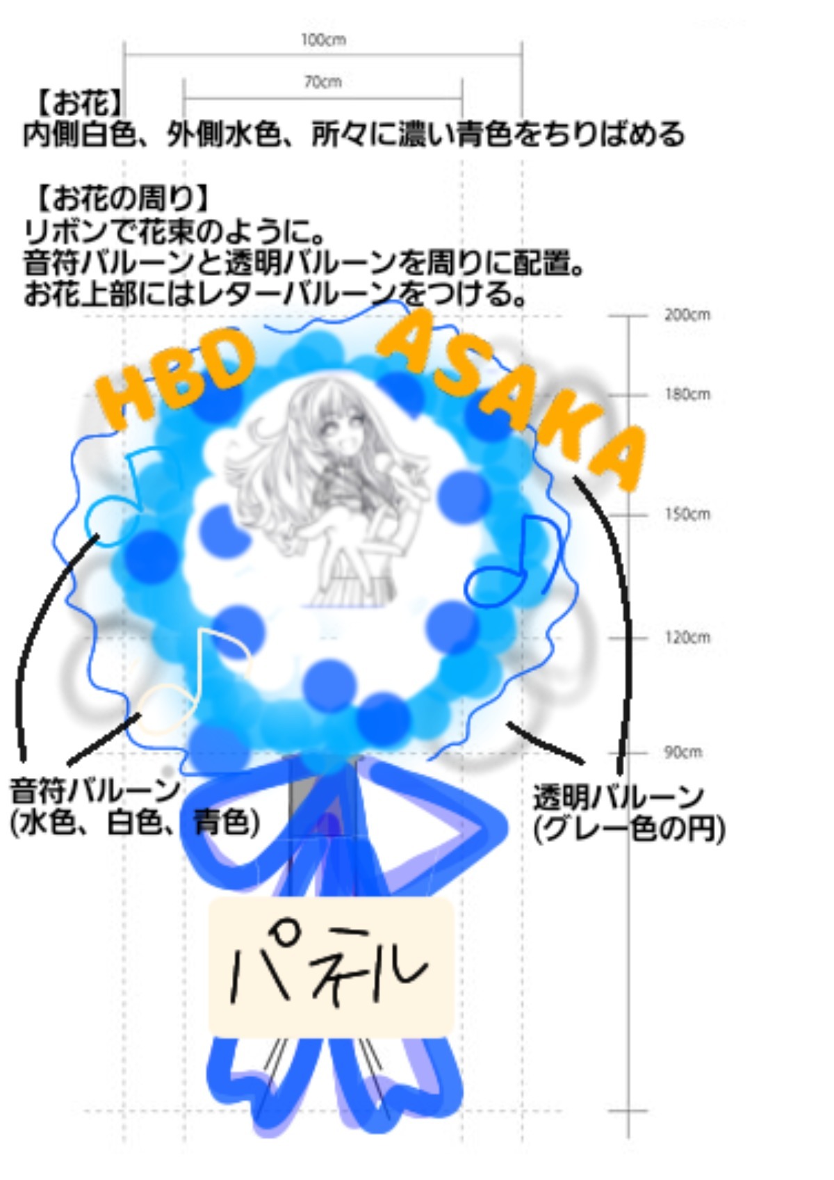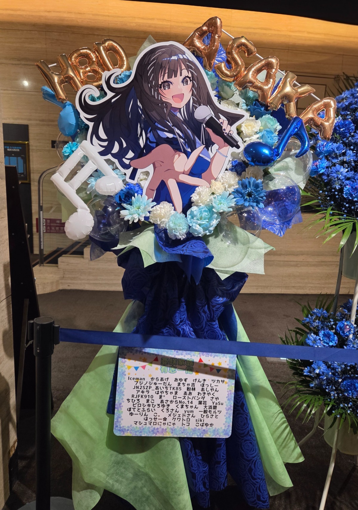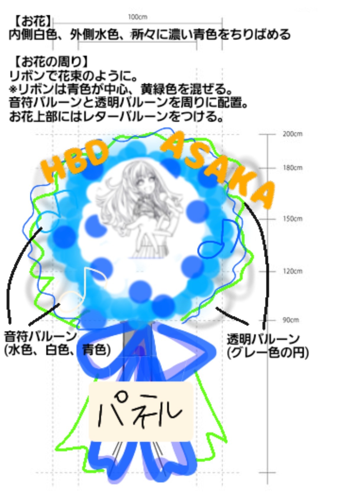 今回のライブグッズ詳細が発表され、イメージカラーが緑色ということがわかりましたので、周りのリボンに黄緑色を追加していただくようお花屋さんに依頼しました!