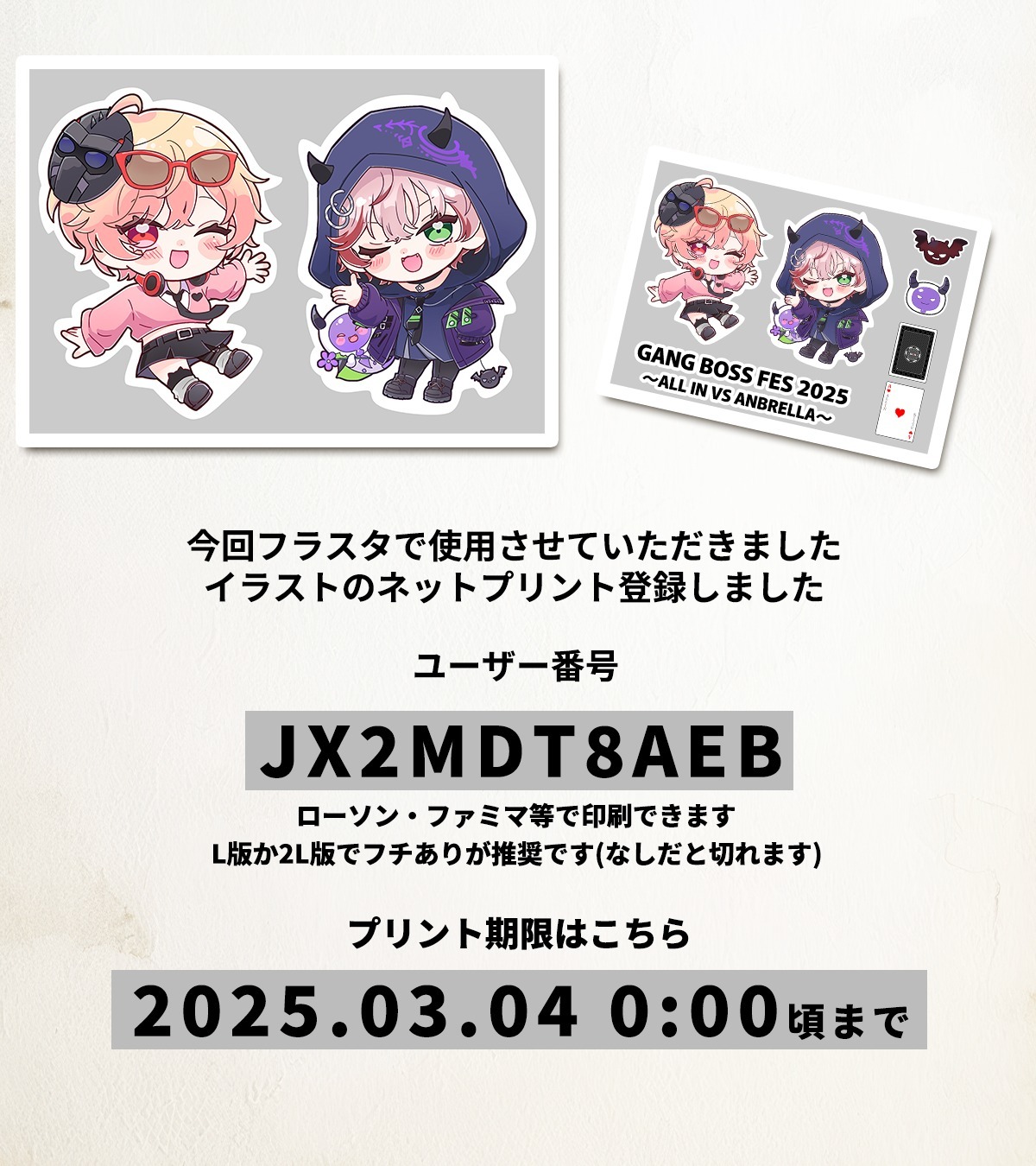 今回フラスタに使用させていただいたイラストを期間限定でネットプリントにてご利用いただけるようにいたしました。こちらは、参加していただいた皆様へのお礼としてご用意しております。ユーザー番号につきましては、外部に公開しないようご配慮をお願いいたします。