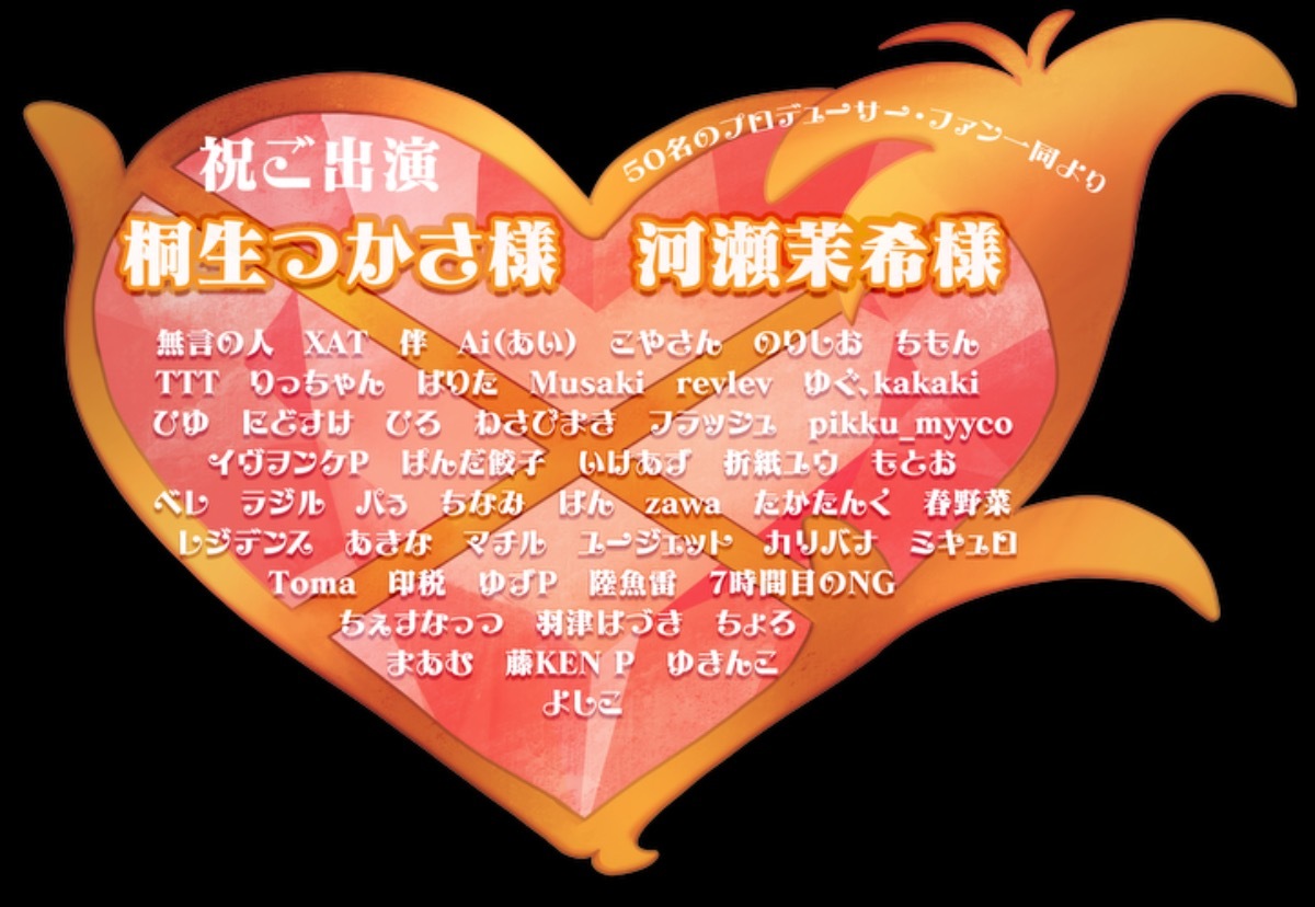 50名のプロデューサーやファンの方々と一緒におふたりに素敵なフラワースタンドを届けられたらと思います。