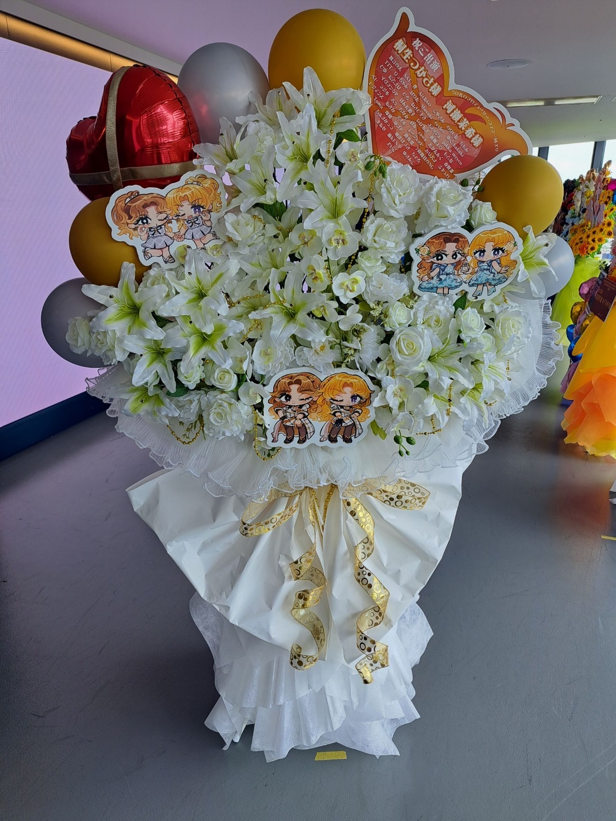 カサブランカのお花をメインに、白系のお花をボリュームたっぷりで、パールや金銀のビーズチェーン、リボン、バルーン等、華やかに作っていただきました!ハートのバルーン、参加者の皆様のパネルはつかさの初期から身につけているハートとクロスのアクセサリーイメージのデザインになっています。