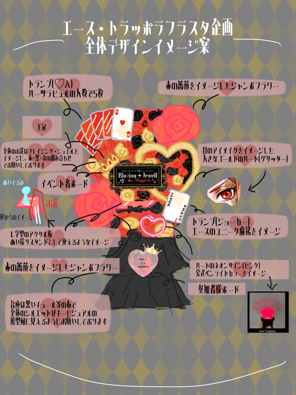 ・台座はスタンド全体が、ブレイジングジュエル衣装のキービジュアル背景の棺型シルエットになるようなイメージで、黒いチュール布等で仕上げていただくようお花屋さんにお願いしております。