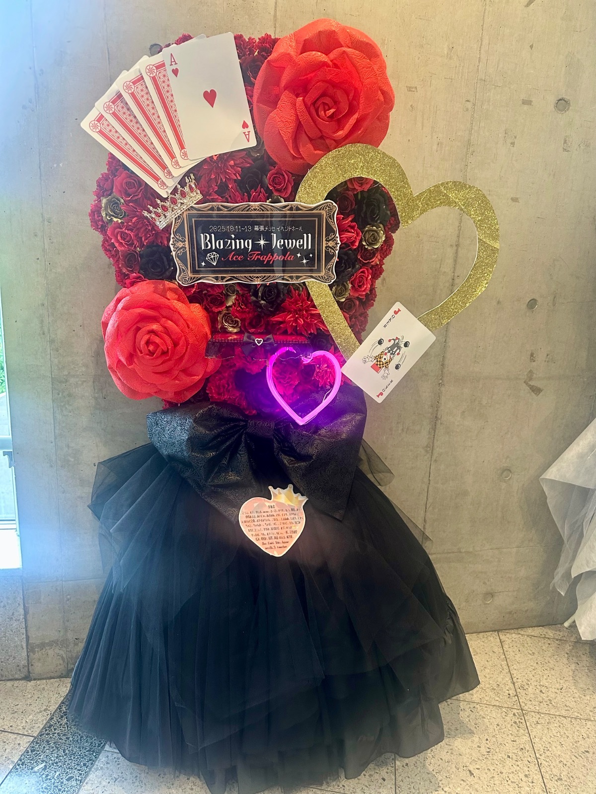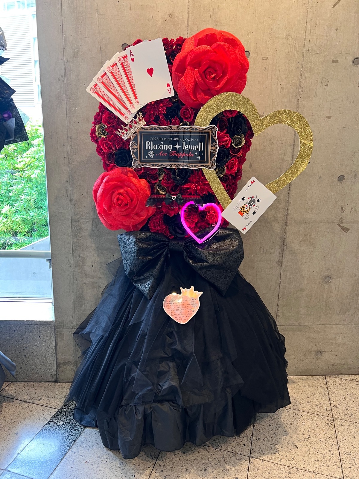 ・全体のお花はブレイジングジュエル衣装のキービジュアルをイメージして、赤×黒×金の配色にてお花屋さんに依頼しております。