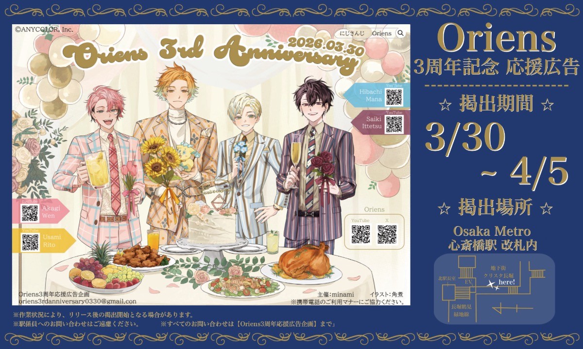 本日より 【 Osaka Metro 心斎橋駅 改札内 】 にて、Oriens の3周年を記念した応援広告が掲出開始となりました🦖