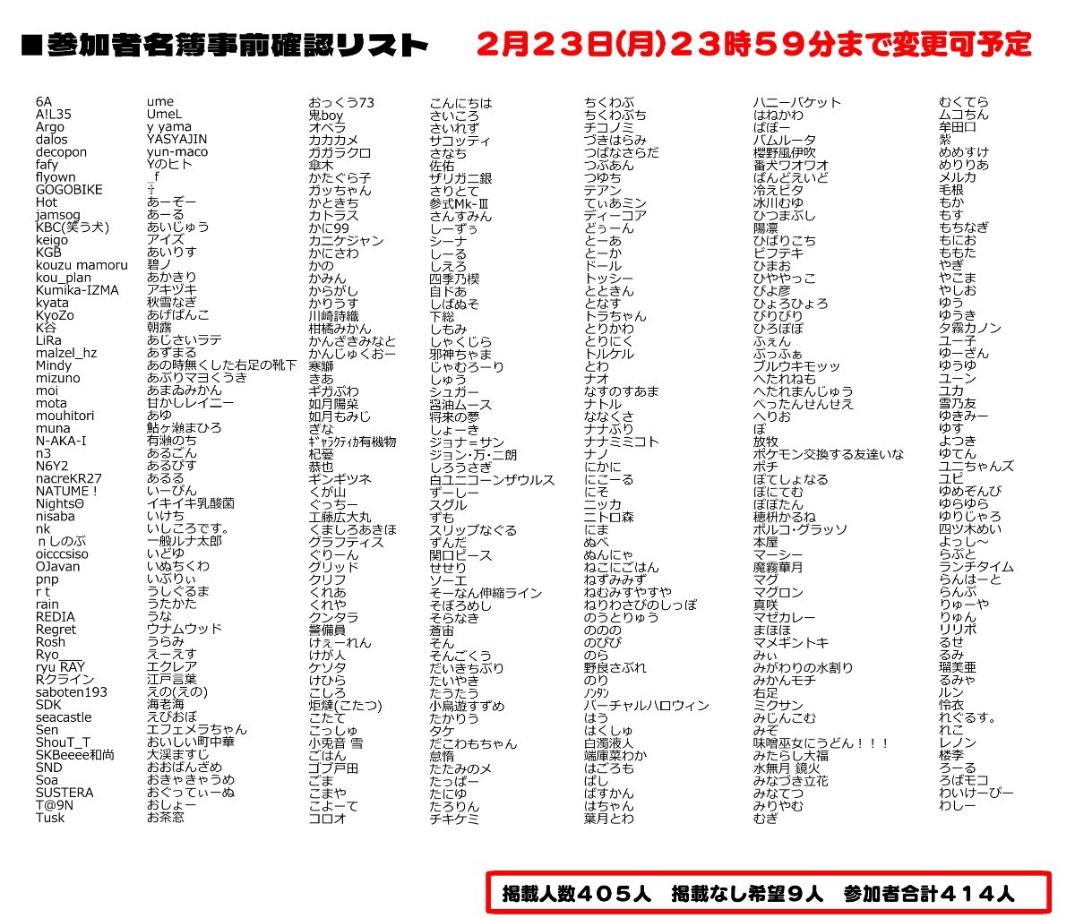 参加募集終了に伴いお花の傍に掲示するお名前の事前確認リストを作成いたしました 参加者のせんせえは添付画像、もしくは企画ページTOPにてご自身のお名前の有無と表記間違いがないか事前確認のご協力をお願いいたします …!