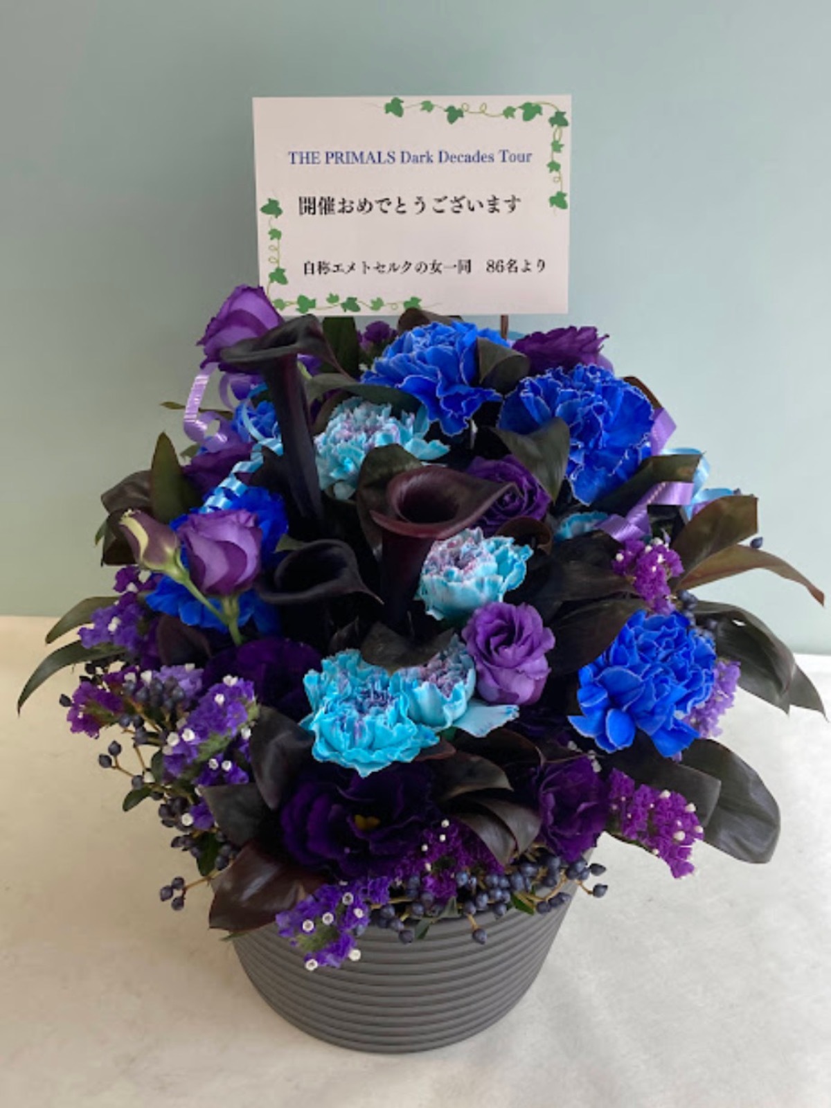 楽屋花はカーネーション、カラー、トルコキキョウを中心に、青黒紫でお作りいたしました。 -