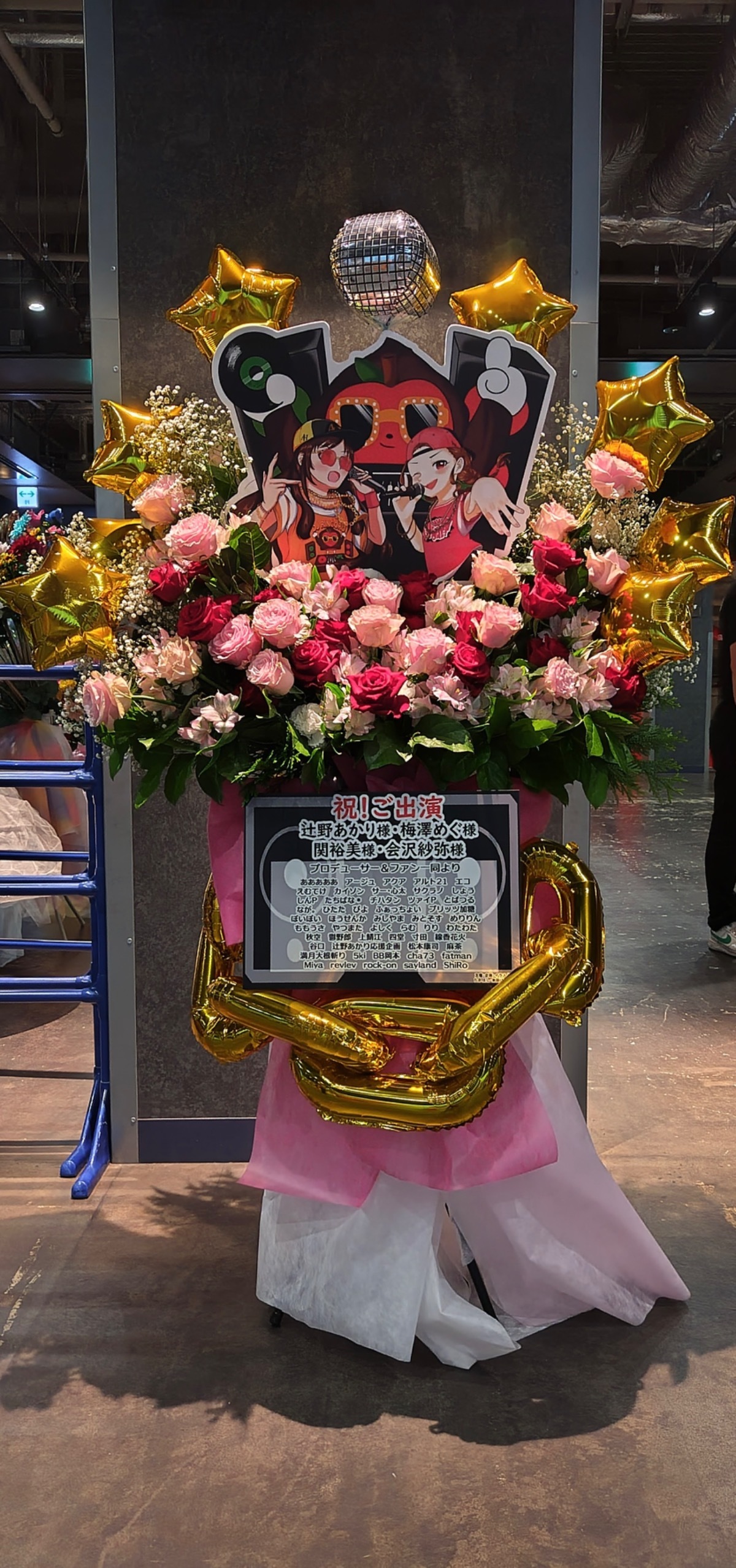 お世話になっております。 お花屋さんより設置完了の報告を受けたので写真を送付させて頂きます。 お花屋さんからのお話によると 「花材はバラ、カーネーション、アルストロメリア、かすみ草です。」 とのことです。 また、収支についてはライブ終了後に行いますので今しばらくお待ちください🙇♂️ 【一言】