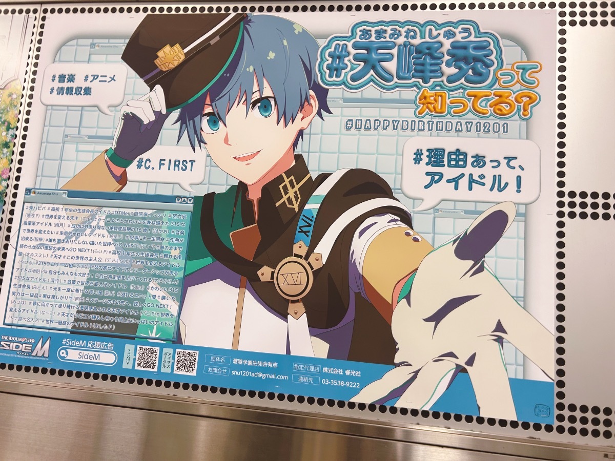 本日12月1日より7日まで東急東横線渋谷駅にて天峰秀くんのお誕生日応援広告が掲出されています。
