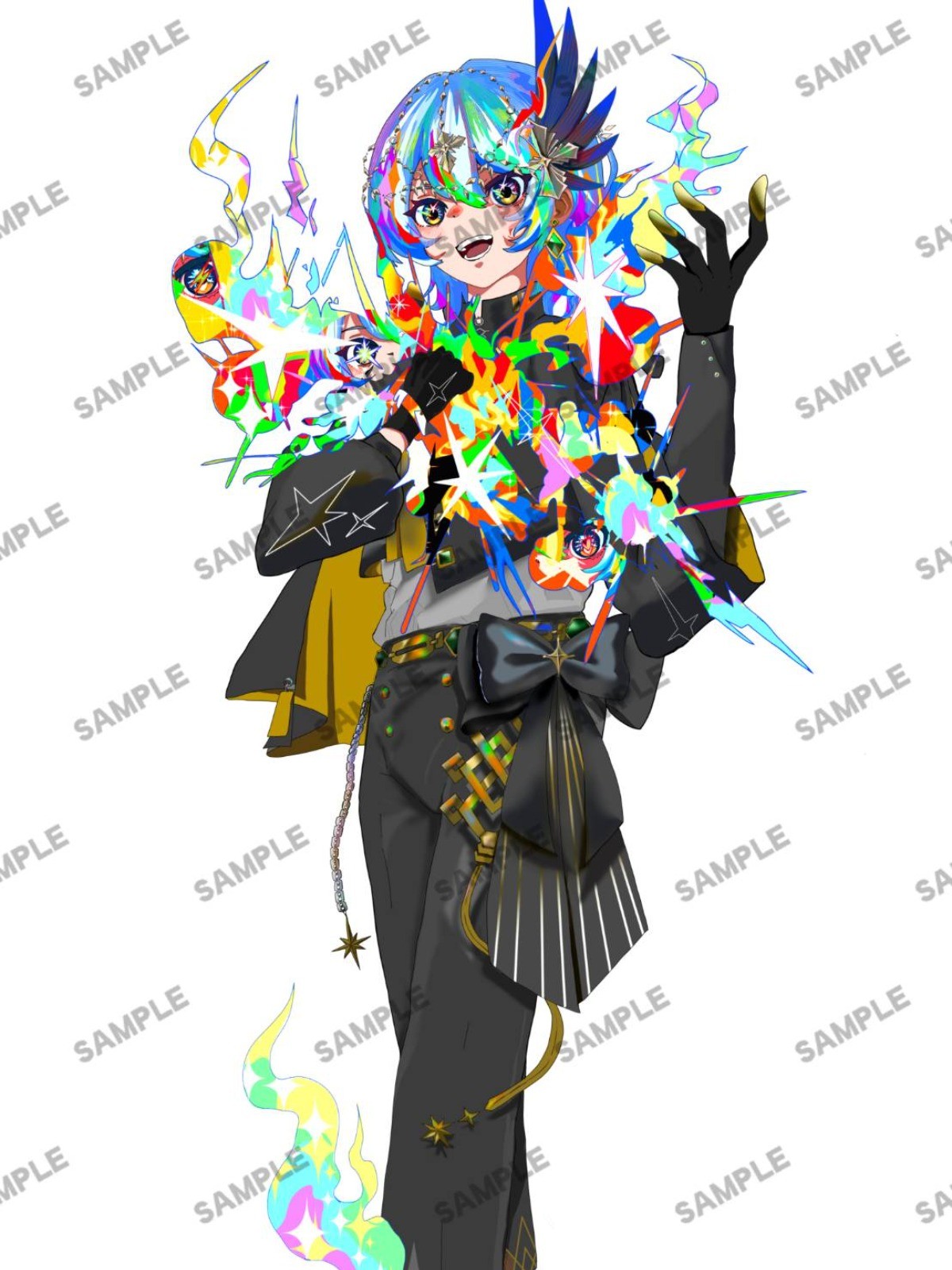あのライブが革命だとするなら、REBOOTは再革命。もう一度すべてを爆発させるような勢いが必要だと思った時、爆発といえば、新星目録のジャケ写のポーズが浮かびました。そこで、そのポーズを今回の衣装に当てはめてオマージュし、新しい「星街すいせい」を形にしました。さらに、不死鳥のイメージを重ね、炎と爆発を自分なりの解釈で描き込んでいます。
