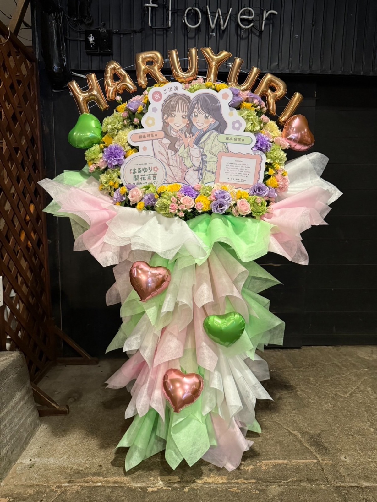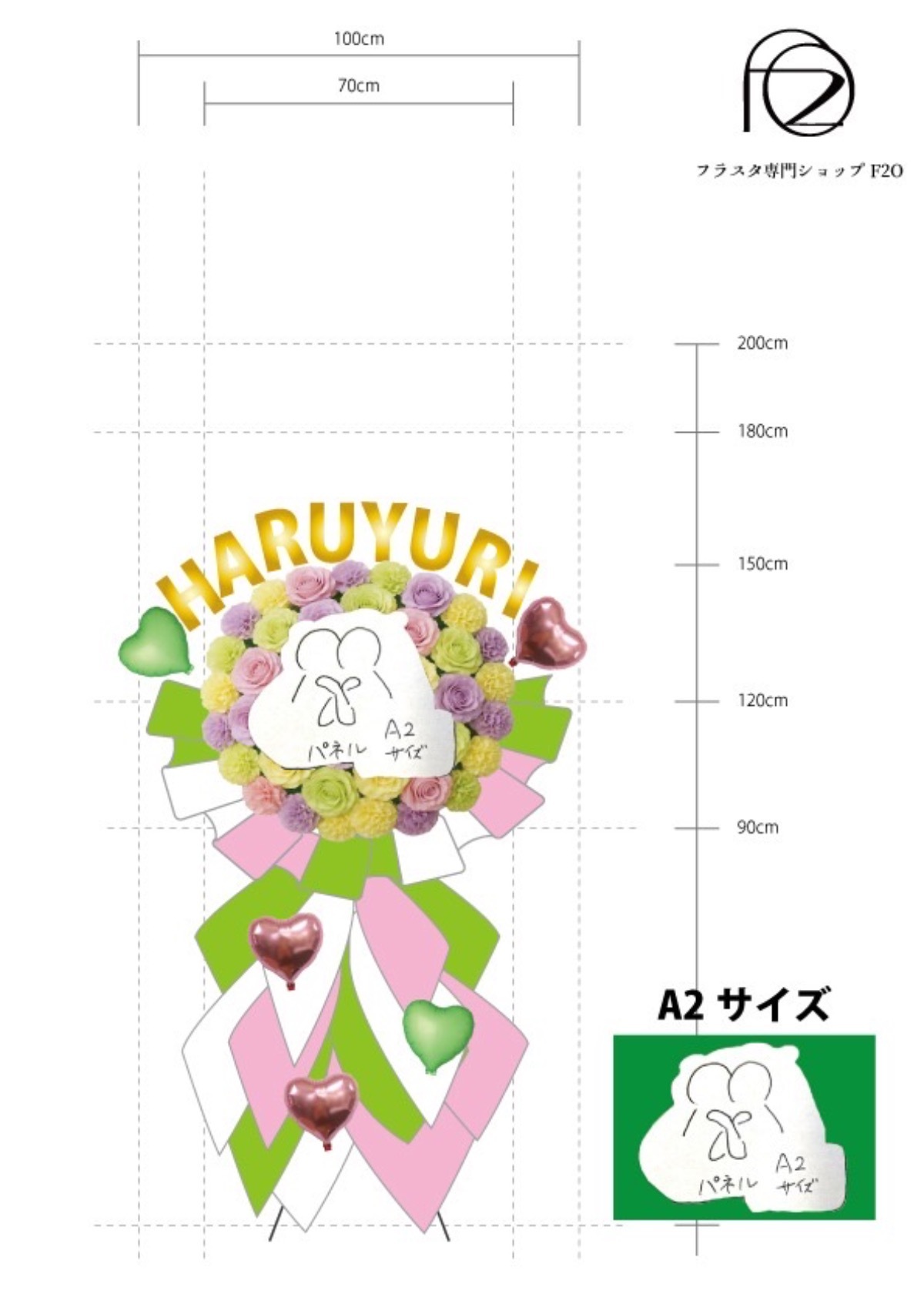 今回、フラスタ高さのレギュレーションが180cm以下ということで、通常サイズだと190cmになってしまうということでしたので、ショートサイズ(160cmくらい)になります。